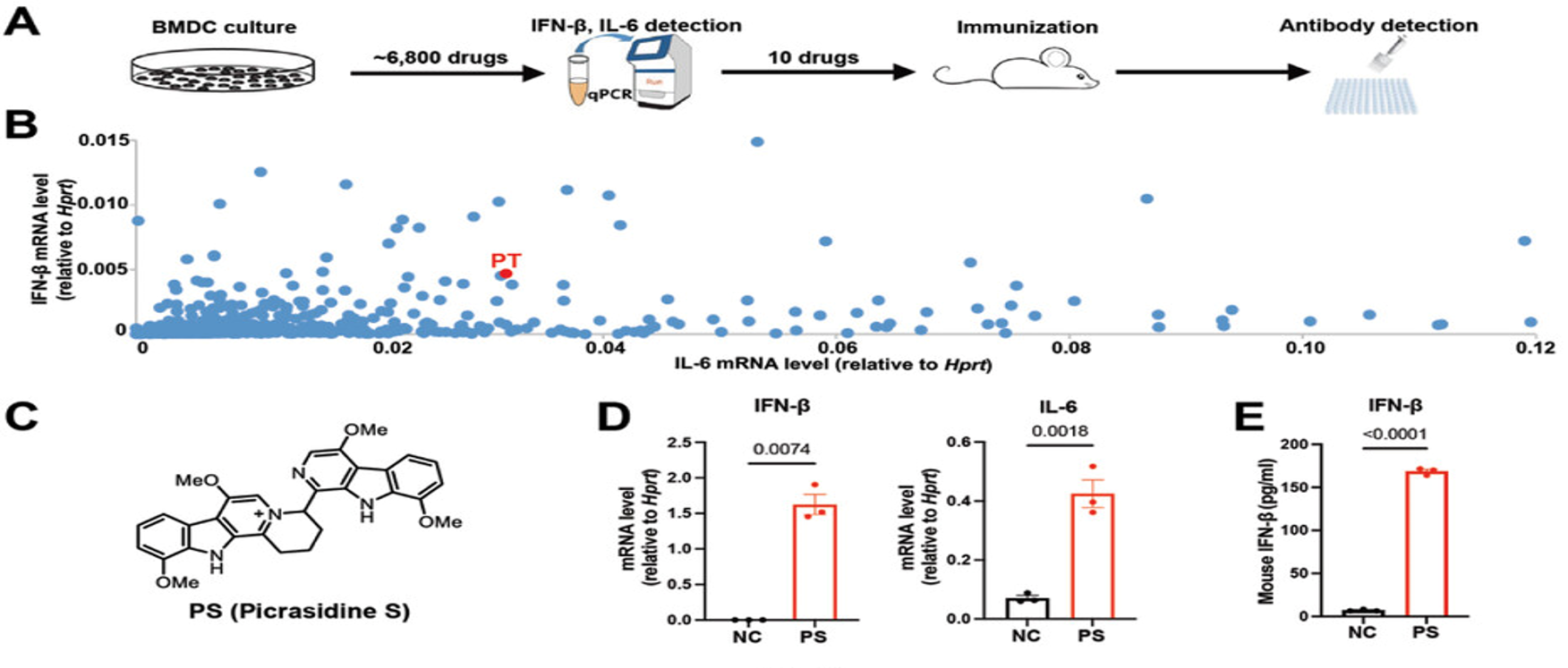 New adjuvants that trigger cellular immune responses are urgently needed for the effective development of cancer and virus vaccines. Motivated by recent discoveries that show activation of type I interferon (IFN-I) signaling boosts T cell immunity, this study proposes that targeting this pathway can be a strategic approach to identify novel vaccine adjuvants. Consequently, a comprehensive chemical screening of 6,800 small molecules is performed, which results in the discovery of the natural compound picrasidine S (PS) as an IFN-I inducer. Further analysis reveals that PS acts as a powerful adjuvant, significantly enhancing both humoral and cellular immune responses. At the molecular level, PS initiates the activation of the cGAS-IFN-I pathway, leading to an enhanced T cell response. PS vaccination notably increases the population of CD8+ central memory (TCM)-like cells and boosts the CD8+ T cell-mediated anti-tumor immune response. Thus, this study identifies PS as a promising candidate for developing vaccine adjuvants in cancer prevention.