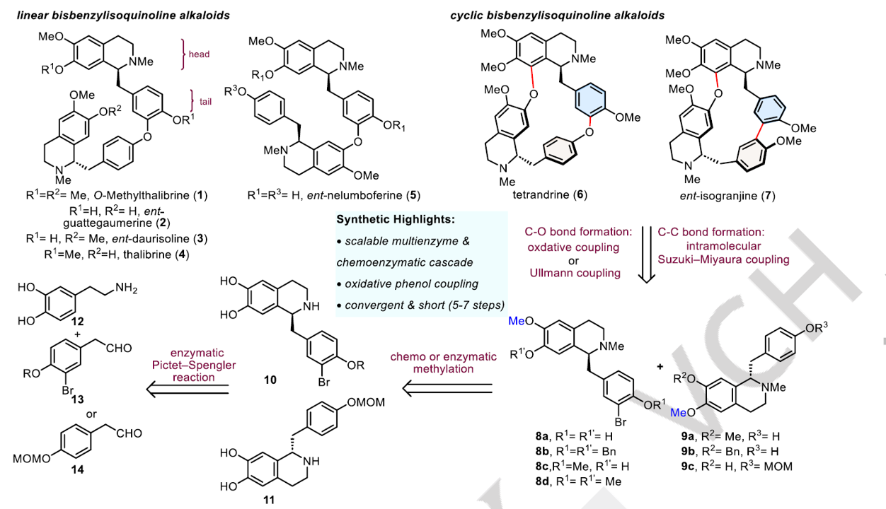 The bisbenzylisoquinoline alkaloids (bisBIAs) have attracted tremendous attention from the synthetic community due to their diverse and intriguing biological activities. Herein, we report the convergent and modular chemoenzymatic syntheses of eight bisBIAs bearing various substitutes and linkages in 5-7 steps. The gram-scale synthesis of various well-designed enantiopure benzylisoquinoline monomers was accomplished via an enzymatic stereoselective Pictet–Spengler reaction, followed by regioselective enzymatic methylation or chemical functionalizations in a sequential one-pot process. A modified intermolecular copper-mediated Ullmann coupling enabled the concise and efficient total synthesis of five different linear bisBIAs with either head-to-tail or tail-to-tail linkage. A biomimetic oxidative phenol dimerization selectively formed the sterically hindered, electron-rich diaryl ether bond, and subsequent intramolecular Suzuki–Miyaura domino reaction or Ullmann coupling facilitated the first enantioselective total synthesis of three macrocyclic bisBIAs, including ent-isogranjine, tetrandrine and O-methylrepandine. This study highlights the great potential of chemoenzymatic strategies in the total synthesis of diverse bisBIAs and paves the way to further explore the biological functions of these natural products.