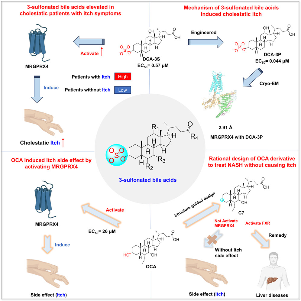 Chronic itch is a debilitating symptom profoundly impacting the quality of life in patients with liver diseases like cholestasis. Activation of the human G-protein coupled receptor, MRGPRX4 (hX4), by bile acids (BAs) is implicated in promoting cholestasis itch. However, the detailed underlying mechanisms remain elusive. Here, we identified 3-sulfated BAs that are elevated in cholestatic patients with itch symptoms. We solved the cryo-EM structure of hX4-Gq in a complex with 3-phosphated deoxycholic acid (DCA-3P), a mimic of the endogenous 3-sulfated deoxycholic acid (DCA-3S). This structure revealed an unprecedented ligand-binding pocket in MRGPR family proteins, highlighting the crucial role of the 3-hydroxyl (3-OH) group on BAs in activating hX4. Guided by this structural information, we designed and developed compound 7 (C7), a BA derivative lacking the 3-OH. Notably, C7 effectively alleviates hepatic injury and fibrosis in liver disease models while significantly mitigating the itch side effects.