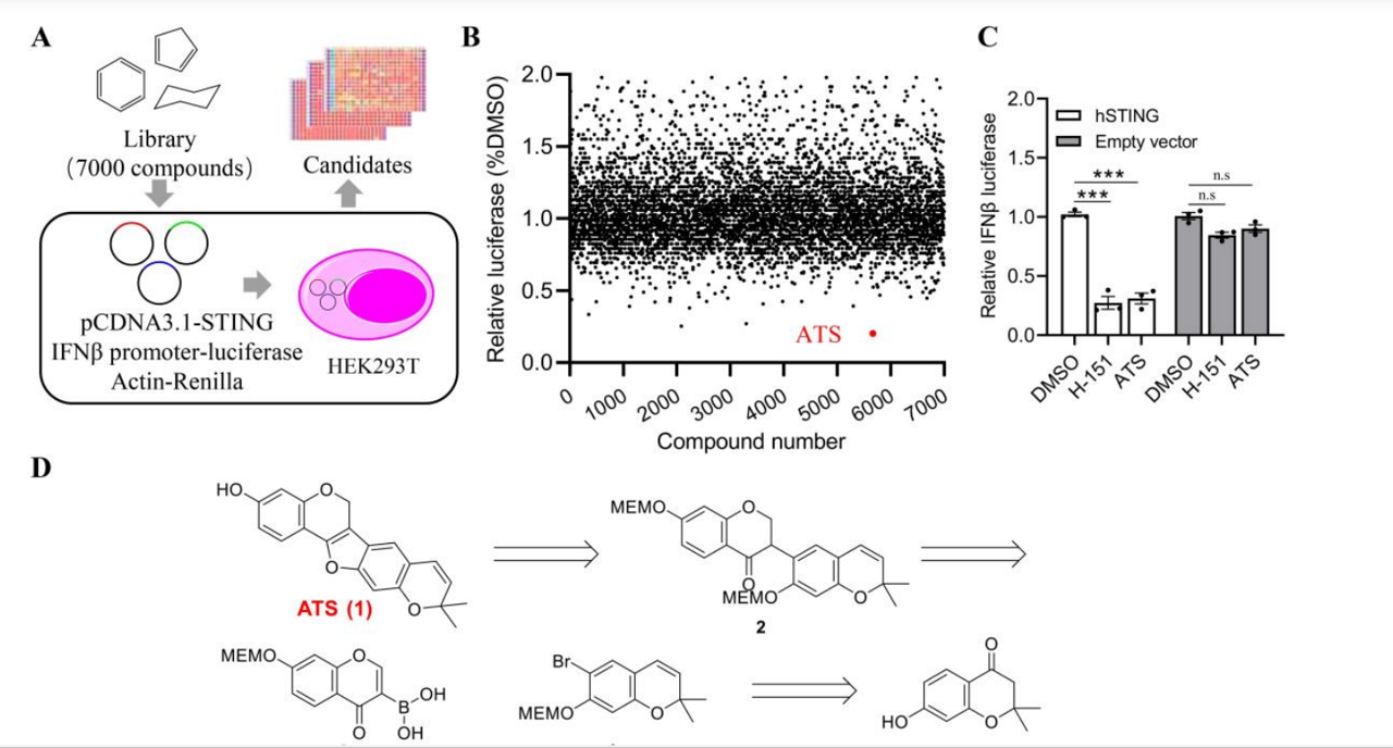 Excessive activation of the stimulator of the interferon gene (STING) pathway has been identified as a significant contributor to various autoimmune diseases, such as STINGassociated vasculopathy with infantile-onset (SAVI) and inflammatory bowel disease (IBD). However, discovering effective STING antagonists for treating STING-mediated autoimmune disorders remains challenging. Herein, we identified the natural product anhydrotuberosin (ATS) as a potent STING antagonist by a high-throughput chemical screen and follow-up biological validations. However, the limited supply from natural product isolation impeded the pharmacological evaluations of ATS. Accordingly, we developed a concise and scalable total synthesis of ATS in 6 steps. Enabled by total synthesis, we further extensively investigated ATS’s mode of action and evaluated its therapeutic potential. Remarkably, ATS inhibits STING signaling in PBMCs derived from three SAVI patients. ATS showed decent pharmacokinetic parameters and strongly alleviated tissue inflammation in DSS-induced IBD colitis and Trex1-/- autoimmune animal models with low toxicity. Collectively, this research lays the foundation for developing novel STING antagonists as an effective therapy for autoinflammatory and autoimmune diseases.