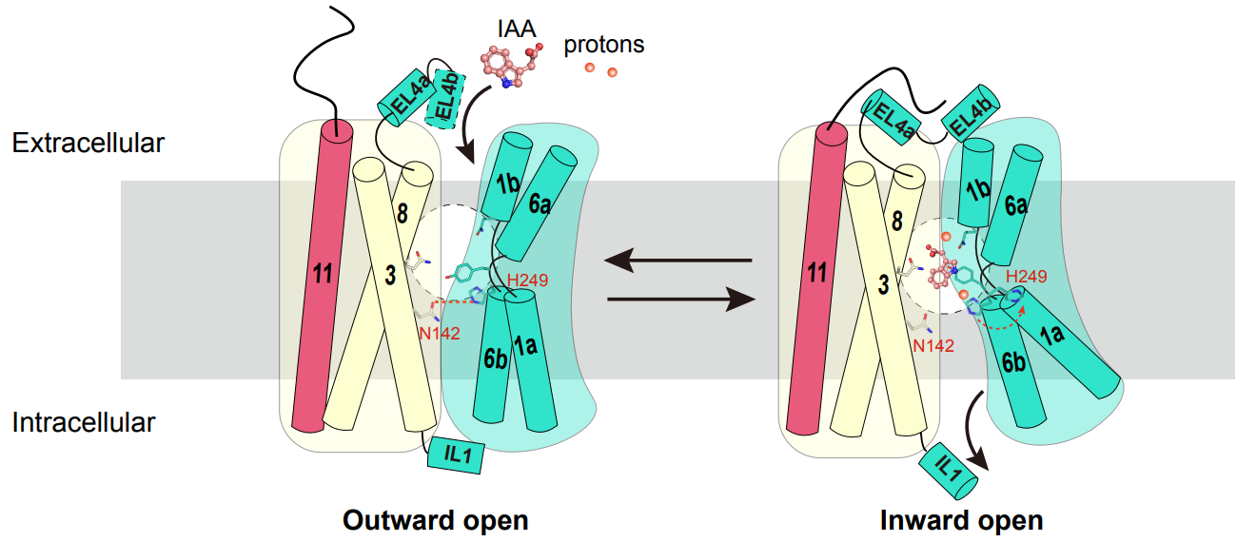 Auxin regulates many aspects of plant growth and development, featuring polar auxin transport mediated by auxin efflux and influx carriers. AUX1 is the prominent auxin importer that actively takes up natural and synthetic auxins. However, the precise mechanisms by which AUX1 recognizes and transports auxin remain elusive. Here, we describe the cryo-electron microscopy structures of Arabidopsis thaliana AUX1 in apo and auxin-bound forms, revealing the structural basis for auxin recognition. AUX1 assumes the LeuT-like fold in an inward conformation. The auxin analogue 2,4-D is recognized by polar residues in the middle of AUX1. We identify a putative cation site in AUX1, which plays a role in stabilizing the inward-facing conformation. His249 undergoes a large conformational shift, and mutation of it completely abolished transport activity, suggesting a crucial role of His249 in AUX1 gating. Together, this study provides a structural foundation for a deeper comprehension of auxin influx by AUX1-like carriers.