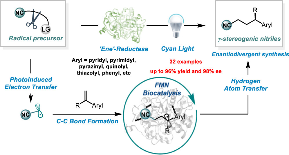 Organic nitriles are significant in pharmaceuticals, agrochemicals, cosmetics, and materials. Although numerous cyanidation methods have been developed, more eco-friendly and green protocols for manufacturing alkyl nitriles are in high demand. Here, we report a photoenzymatic enantioselective intermolecular hydrocyanoalkylation of alkenes catalyzed by flavin-dependent “ene”-reductases. The discovery of stereocomplementary enzymes that provide access to both enantiomers of the high-value nitriles further showcases the synthetic applications of this method. Radical trapping, isotopic labeling, and spectroscopic experiments have elucidated the formation of a charge transfer complex at the protein active site. The single-electron reduction of the cyanoalkyl radical precursor by flavin hydroquinone yields a cyanoalkyl radical, which then undergoes intermolecular radical addition. This active site can stereoselectively control the radical-terminating hydrogen atom transfer, enabling the synthesis of enantioenriched γ-stereogenic nitriles. This work further expands the reactivity repertoire of biocatalytic transformations via non-natural radical mechanisms.