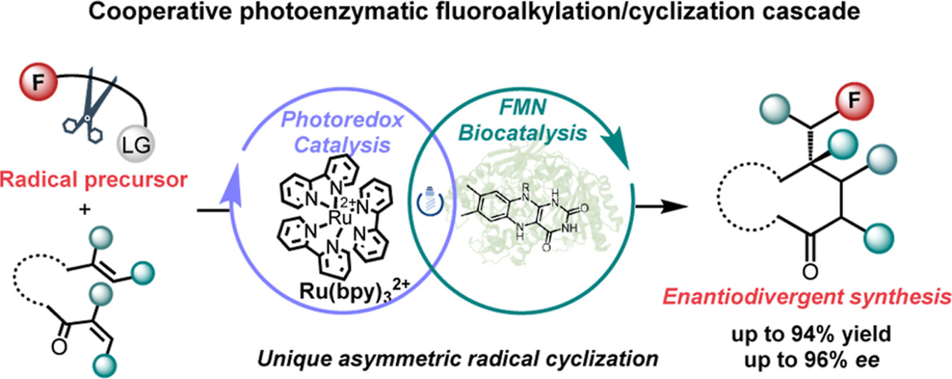 Due to the invaluable properties of organofluorine compounds, incorporating a fluorinated unit has become necessary in pharmaceuticals, agrochemicals, and materials. However, achieving asymmetric fluorination such as trifluoromethylation through chemo- or biocatalysis has been a synthetic challenge. Here, we introduce a unique cooperative photoenzymatic catalysis for the enantioselective fluoroalkylation/cyclization cascade. This method, utilizing the engineered flavin-dependent “ene”-reductases (EREDs) and an exogenous photocatalyst (PC), produces a variety of fluorinated cyclic ketones with high yield and enantioselectivity. The discovery of stereocomplementary enzymes that provide access to both enantiomers of the cyclized products further enhances the synthetic applications of our method. The radical-trapping, spectroscopic, and kinetic studies have substantiated the interaction mode between the PC and the enzyme and demonstrated a cascade reaction mechanism involving a unique intermolecular addition of fluorinated radicals and a stereocontrolled intramolecular cyclization. Isotopic labeling experiments support flavin as the source of the hydrogen atom. Molecular dynamics simulations reveal that the binding interaction of the enzyme and the intermediate triggers the photoinduced enantioselective cyclization. This work underscores the potential of enzymes for the asymmetric synthesis of fluorinated compounds.