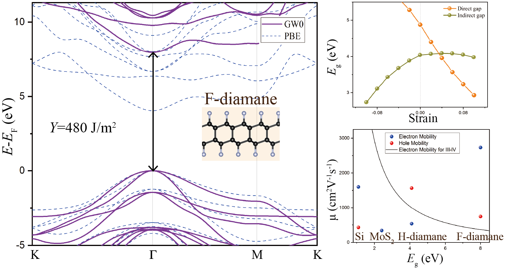 Abstract: Very recently, fluorinated single-layer diamond (called diamane) was successfully prepared for the first time through the conversion of bilayer graphene in a mild way using a chemical vapor deposition approach, which is stable under ambient atmosphere. Herein, we performed in-depth first-principles calculations on fluorinated and hydrogenated diamane. Our calculations reveal that fluorinated diamane is an ultrathin material with a direct-wide bandgap at the G-point, which is 3.86 eV larger than that of hydrogenated diamane, when using the G0W0 method. Such a bandgap could be effectively modulated by applying external strains or introducing fluorine vacancy defects. Besides, their elastic moduli are comparable to that of graphene and higher than those of most other 2D materials. The ideal tensile strength is dictated by soft-mode phonon instability under uniaxial tension and elastic instability under biaxial strain. Most surprisingly, we found that the calculated electron mobility (2732 cm2 V-1 s-1) and hole mobility (1565 cm2 V-1 s-1) in these two diamond-like monolayers are superior to those of III–V semiconductor compounds. Finally, the Raman-active phonon frequencies were characterized to serve as a fingerprint for the experimentally obtained high-quality diamane. These features will provide these materials with great potential for future applications in nano-optics, nanoelectronics, and nano-electromechanical systems.