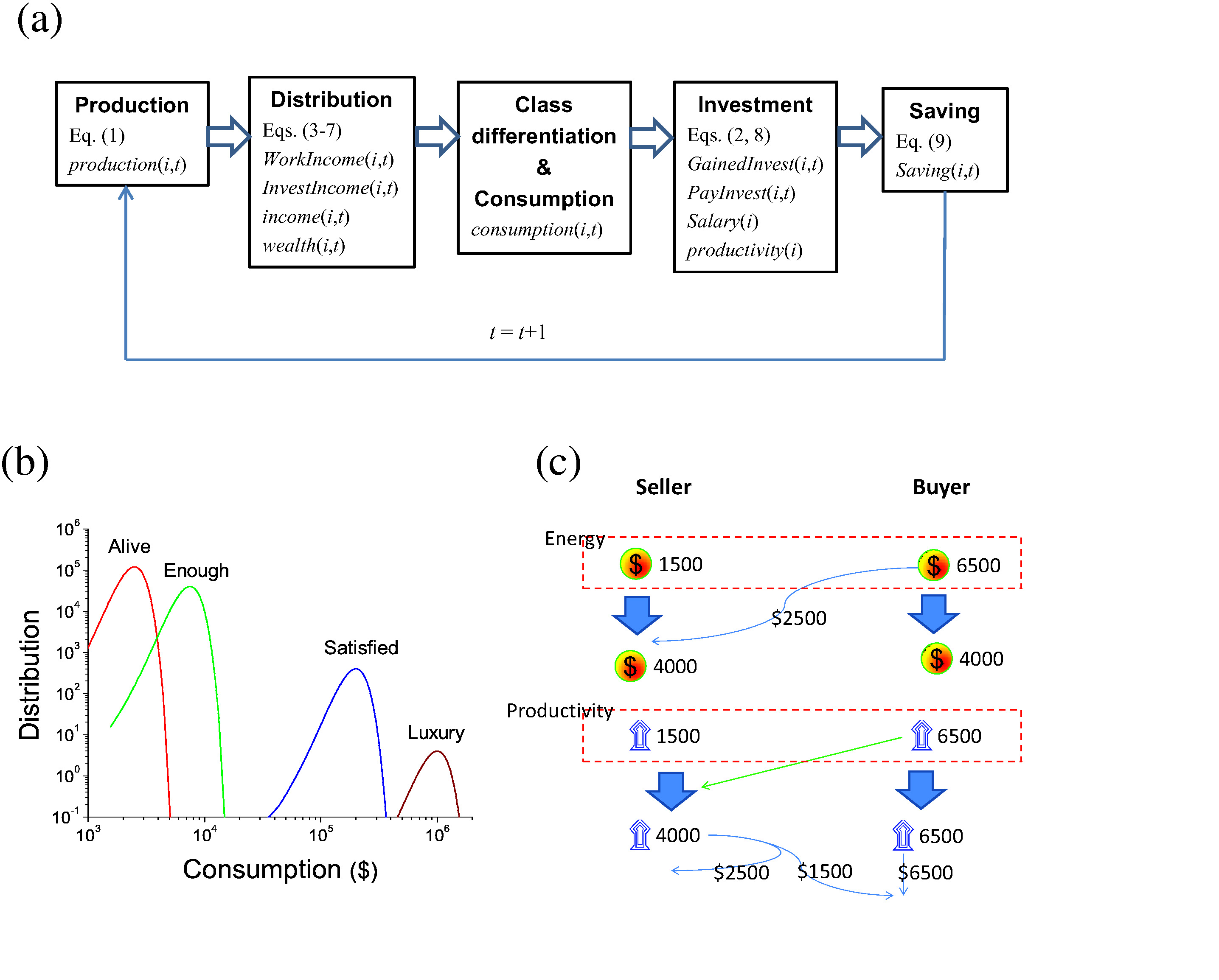 Abstract: Wealth and income inequality has attracted intensive interest in recent years due to its great significance both in reality and theory. Inspection on individual behaviors in a microscopic view would be useful in clarifying possible reasons for inequality and proper policies for reducing inequality and poverty. This paper presents an inhomogeneous agent-based model to explore the emergence of income inequality, in which individuals with varied qualities work, consume and invest. In despite of the small attribute difference for individuals, large income/wealth inequality and class differentiation naturally occur through a mechanism of capital (investment) income, which shares some analogy to the endogenous growth. The obtained income distribution is well described with an exponential law at smaller values and a power law at large values. Education, which is modeled as increasing the average productivity and decreasing the productivity width, is able to improve the equality and lower the Gini coefficient. The uplift of salary level hampers the speed of investment (industrialization) and the short-term income, but it brings long-term benefits of higher efficiency and equality. These results support the potential capacity of the model as a basic and open framework to investigate multifarious questions regarding income inequality.