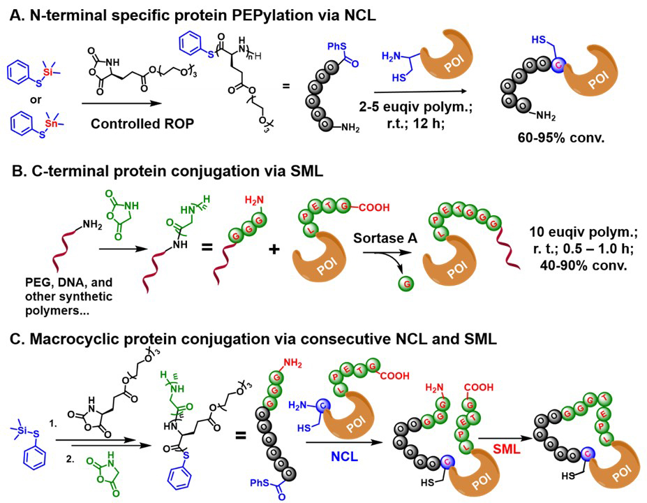 Due to the multi-functionality nature of both protein and polymer, traditional ways coupling this two types of macromolecules are tedious, low efficient, and lack of control on site-specificity. We tackled the problem by developing several methods that can in situ functionalize synthetic polypeptides with desired biorthogonal reactivity for rapid and site-specific bioconjugation (Biomacromolecules, 2016; ACS Macro Lett. 2018; J. Am. Chem. Soc. 2016). The new methods significantly facilitated the protein PEPylation by eliminating efforts for protection, deprotection, and/or pre-/post- modifications. Site-specific conjugates with well-defined topology (e.g. macrocyclic conjugates for the first time) can be readily accessible within 2-3 steps in modest-to-high yield.
