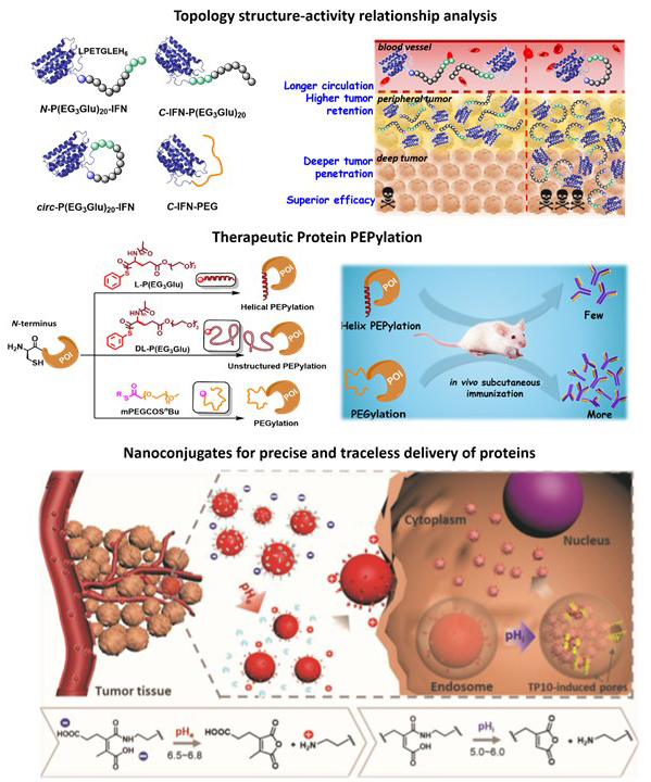 Structurally ill-defined and poorly-characterized protein-polymer conjugates are difficult to optimize their efficacy. We have successfully applied our well-defined protein conjugates for careful in vivo SAR studies. We discovered that macrocyclic interferon PEPylation can impart unusual deep tumor penetration and enhanced antitumor efficacy (J. Am. Chem. Soc. 2018). Moreover, our investigation on the polymer conformation effect unexpectedly revealed that the helix of nonfouling polypeptides can minimize antidrug antibody and antipolymer antibody generation (ACS Cent. Sci. 2019). These works highlight the remarkable benefits of structural precision and may inspire new design principles of PPCs. We also developed a simple and universal formulation generating high-loading protein-polymer nanoconjugates for systemic delivery and traceless release of proteins to the cytosol of tumor cells, which may potentiate versatile proteins therapeutics that act on intracellular targets (Adv. Funct. Mater. 2018).