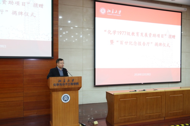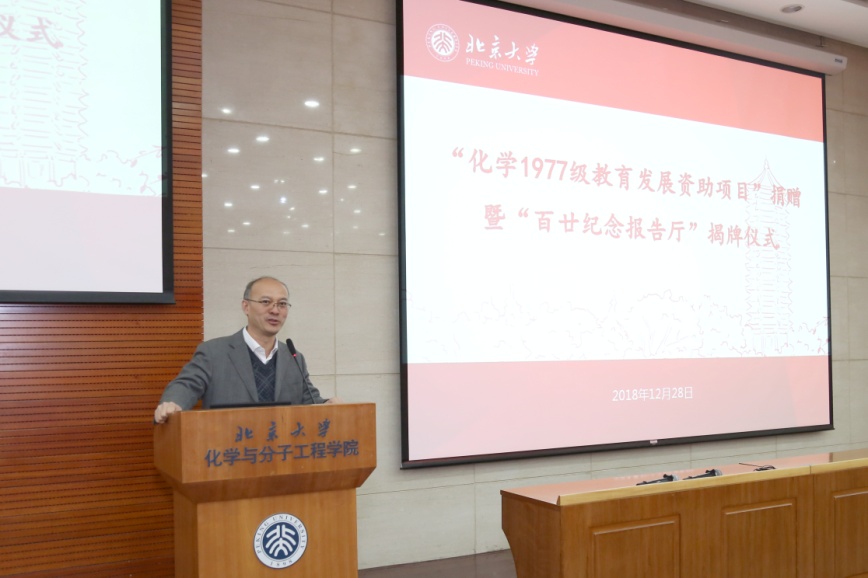 2018年12月28日下午2:00,化学学院在A204报告厅举行了“化学1977级教育发展资助项目”捐赠暨“百廿纪念报告厅”揭牌仪式。北京工商大学崔莉凤教授等10名1977级校友代表参加活动,化学学院党委书记马玉国、副院长周江出席仪式,仪式由党委副书记赵美萍主持。