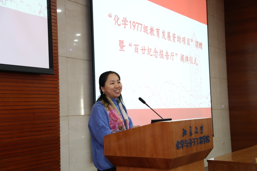 1977级校友代表、筹款工作小组组长崔莉凤教授介绍了1977级校友教育发展资助项目从动议到最终落地实现的过程。这一项目发起于“百廿校庆”1977级入学40周年聚会期间,一经发起便得到了众多校友的响应,全年级超过100位校友参与捐赠。同学们都为身处1977级这个团结有爱的大家庭感到荣幸,为能够参与化学学院的建设发展感到自豪。