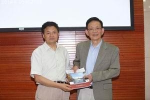 其后,物理学院党委书记陈晓林教授代表物理学院将本次论坛的纪念光盘和文集等纪念品赠送给钟赐贤夫妇,并致辞。陈老师高度评价了本届论坛所取得的成绩,他希望北大的学生以钟盛标先生、钟赐贤先生为榜样,将追求学术和回馈社会的精神传播到世界各地。