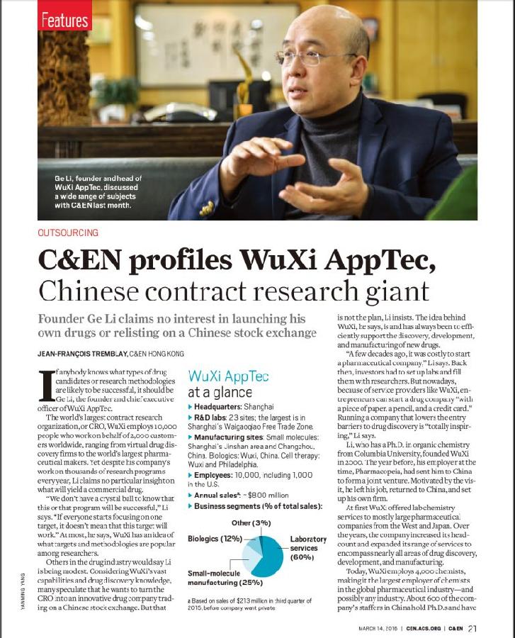 2016年最新一期的美国化学会出版的新闻周刊《C&EN》刊登了其对化学学院1985级校友李革博士的专访《C&EN对话药明康德—中国医药研发合同外包服务企业巨头》。全文主要讲述了李革留美归国后的创业历程和个人理想,以及他所创立医药研发合同外包服务企业(CRO)—药明康德(WuXiAppTech)近些年来的发展情况。