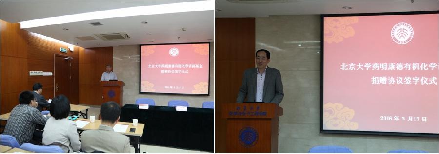 仪式开始由化学学院党委书记刘虎威教授致辞,刘虎威教授代表学院感谢在药明康德等企业界工作的广大校友多年来对学院发展的支持,并表示学院正日益重视产学结合的发展,力争使科研成果转化为经济利益,回馈广大校友,并社会做出更大的贡献。随后有机化学所席振峰院士代表有机化学所致辞,他感谢了药明康德等广大企业多年来支持化学学院人才培养,并表示希望利用好这笔捐赠,举行更多的高质量的学术报告,促进学院学生培养、学术与科研的发展。