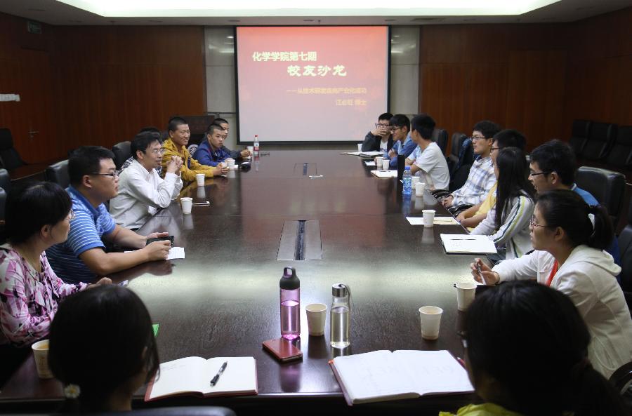 9月10日下午,化学学院在A205会议室举办第七期校友沙龙,此次沙龙邀请到了化学学院84级校友,苏州纳微生物科技有限公司董事长江必旺担任主讲嘉宾,与同学分享自己的学习、科研和创业历程。来自化学学院各年级的20余位同学参加了此次沙龙。