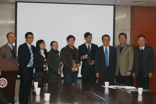 颁奖仪式由高分子系副主任李子臣教授主持。院党委副书记马玉国老师发言表示北大高分子愿与塞拉尼斯等合作伙伴一起努力加强和促进在学生发展与科研两个方面的交流与合作。高分子系主任宛新华教授从科研、师资、研究生培养等几个方面向专程前来参加颁奖仪式的塞拉尼斯公司代表介绍了北大高分子学科发展情况和现状。塞拉尼斯(中国)投资有限公司亚太区商务总监、化学学院1978级校友吴贤亮博士介绍了公司的生产规模以及主要产品,以及在中国发展的规划和布局。他还结合自己求学、工作的经历,回顾过去,展望未来,与同学们进行了真挚的交流,对获奖同学表示祝贺,对他们在科研工作中所做的努力和突出成果予以肯定。获奖研究生代表赵振华同学向客人们汇报了自己的科研进展情况并发表获奖感言。最后,宛新华教授、陈尔强教授、吴贤亮博士、塞拉尼斯公司招聘主管施堂庆先生为获奖研究生高敏、关妍、赵振华、张锐同学颁发了奖金和特制的奖杯。