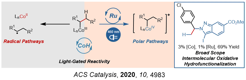Han-Li, Fan, Wei-Ting and Jun-Jie’s work on dual cobalt/photoredox catalysis oxidative hydrofunctionalization has been published on ACS Catalysis. This work highlights a hypothesis-driven approach that uses photochemical oxidation to overcome previous encountered difficulties associated with Co(III)/Co(III) redox process.