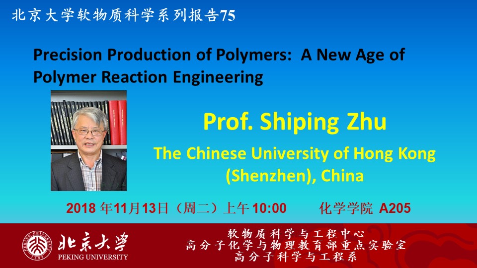 【软物质科学系列报告75】Prof. Shiping Zhu: Precision Production of Polymers: A New Age of Polymer Reaction Engineering