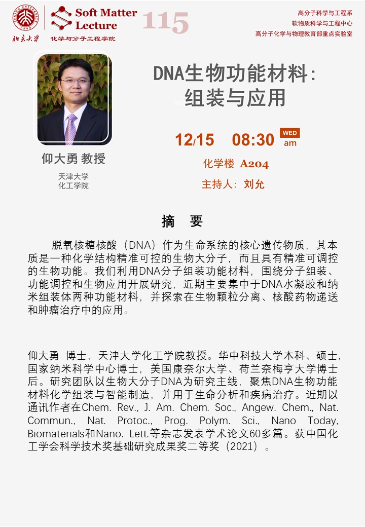 【软物质科学系列报告115】仰大勇教授:DNA生物功能材料:组装与应用