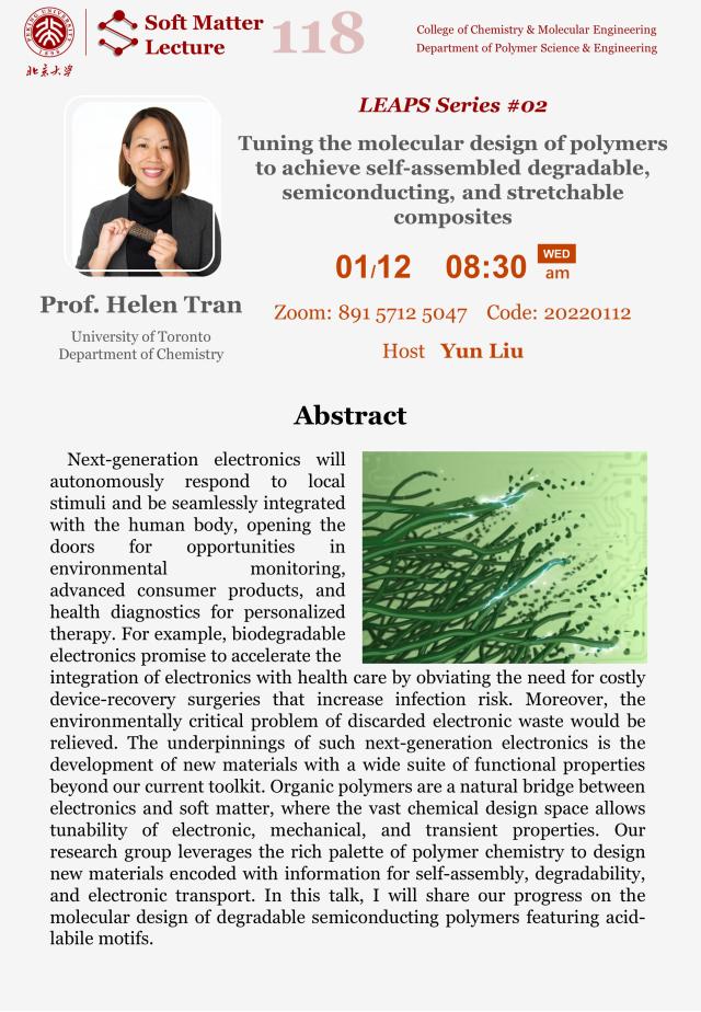 【软物质科学系列报告118】Prof. Helen Tran: Tuning the molecular design of polymers to achieve self-assembled degradable, semiconducting, and stretchable composites