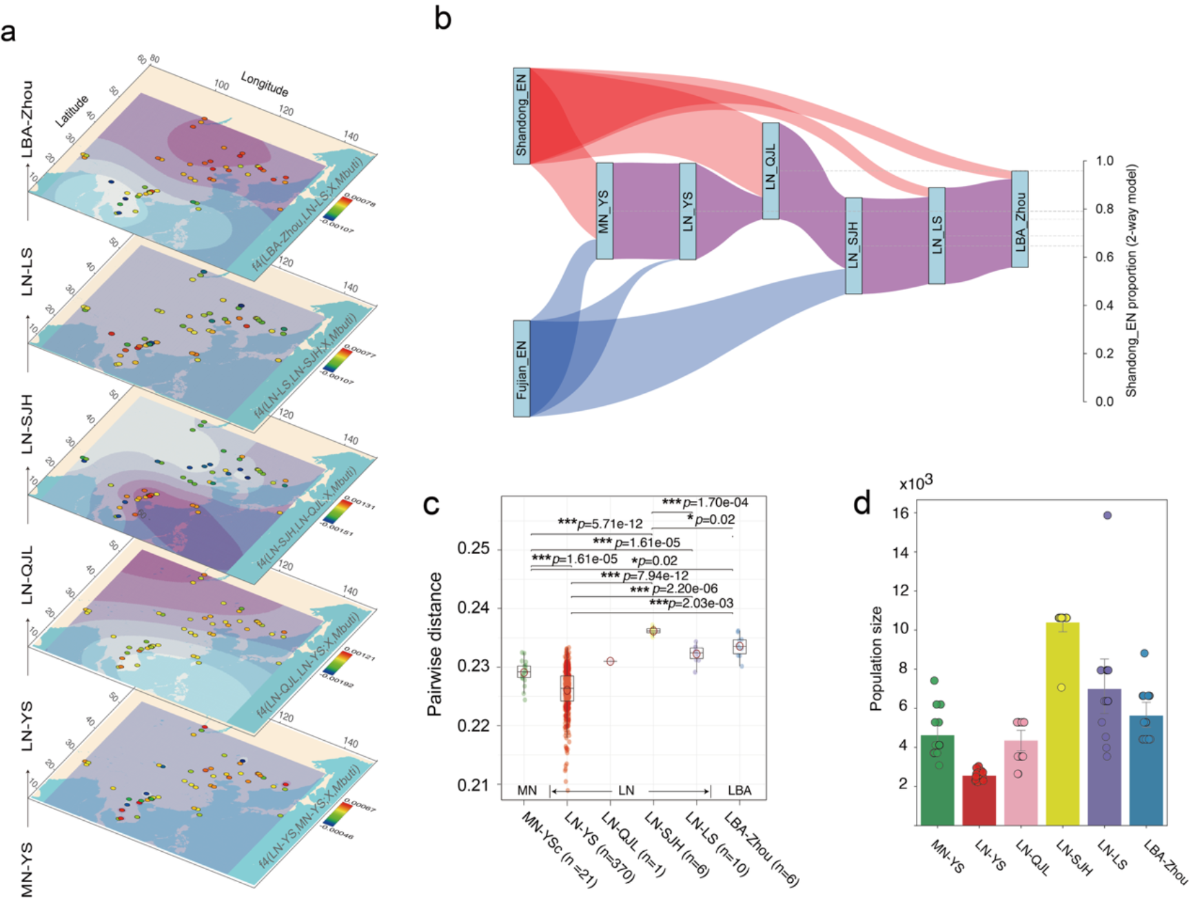 史前长江流域周边遗址的样品受环境和保存条件限制难以获得较高质量的古DNA,该研究团队改进了传统的古DNA双链建库方法提高了分子利用效率,最终获得了八里岗遗址时间跨度为6500-2500BP的58个个体的高质量全基因组数据,包括新石器时代中期仰韶文化(9个个体)、新石器时代晚期仰韶文化(32个个体)、新石器时代晚期屈家岭文化(2个个体)、新石器时代晚期石家河文化(4个个体)、新石器时代晚期龙山文化(6个个体)和青铜时代东周时期(5个个体)。通过综合运用主成分分析(PCA)、无监督聚类(ADMIXTURE)、群体遗传统计(f3/f4-statistics)和混合建模(qpAdm、qpWave)等多种方法对数据进行了全面分析。