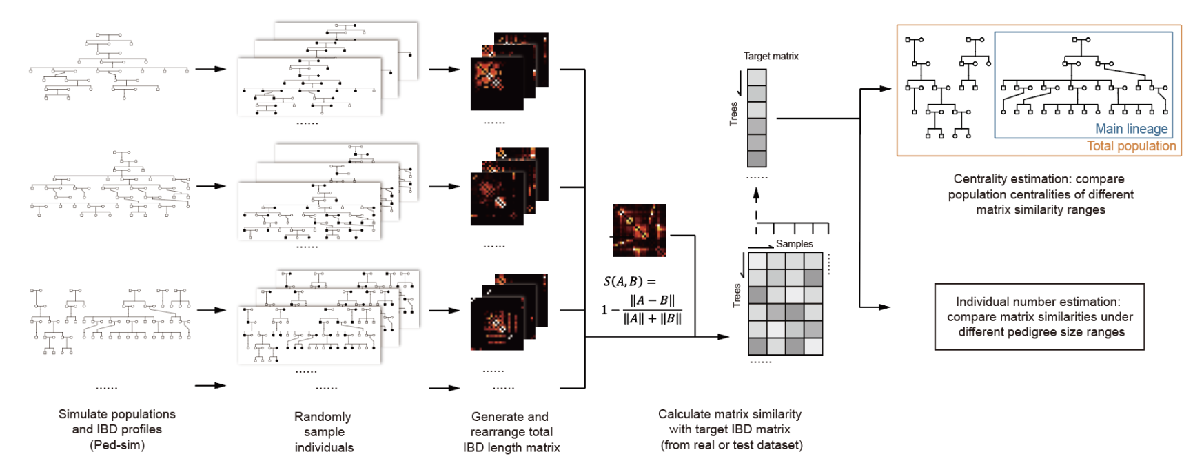 由于M13墓中的个体是二次埋葬,可能存在采样不全和随机性等问题,而且人骨保存情况普遍较差只能获取到墓中部分个体的全基因组数据,很难通过传统的亲缘关系推断方式构建完整家系结构。该研究建立了一种基于IBD共享模式和家系模拟的模糊推断方式用于从稀疏采样的M13样本集中提取有关亲缘结构的信息,并估计其所属社群的总人数范围等。统计模拟结果推断M13墓中的个体来自于男性血缘链接主导的单一家系(高于75%的后验概率下),其总人口规模可能超过200人(高于85%的后验概率下)。考古学的一种代表性观点认为仰韶文化晚期这种大型二次合葬墓盛行的原因可能是为了逝去的家族成员团聚而重新埋葬,以强化本家族以血缘为纽带的凝聚力,增强后代对家族的认同等。该研究首次利用分子人类学与遗传学实证支持了这一猜测,实现了有关人类早期社会组织探究的新突破。