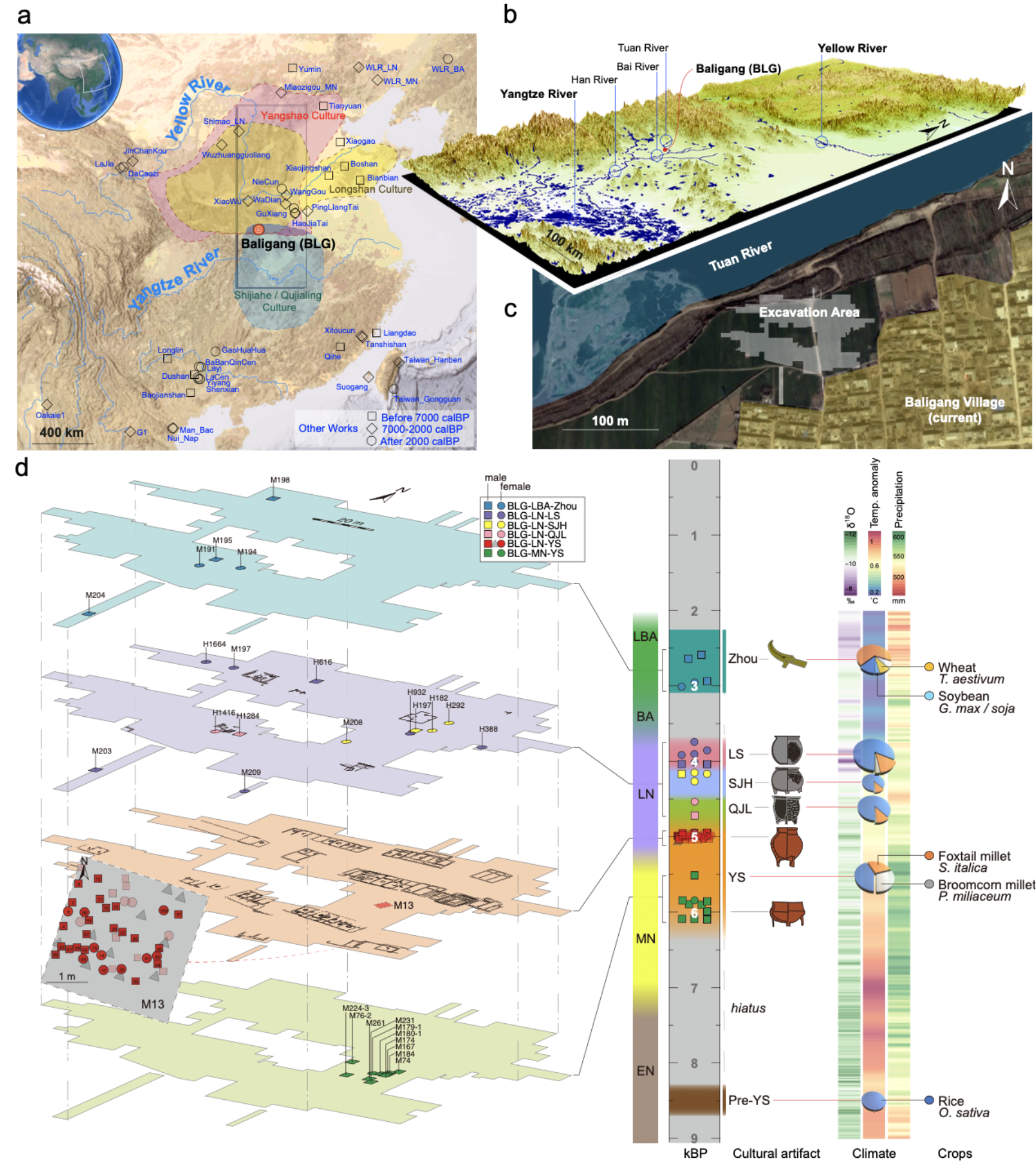 图1. 八里岗遗址的地理位置与遗址文化层时序平面图、不同地层出土文物的类型以及对应的主要气候数据