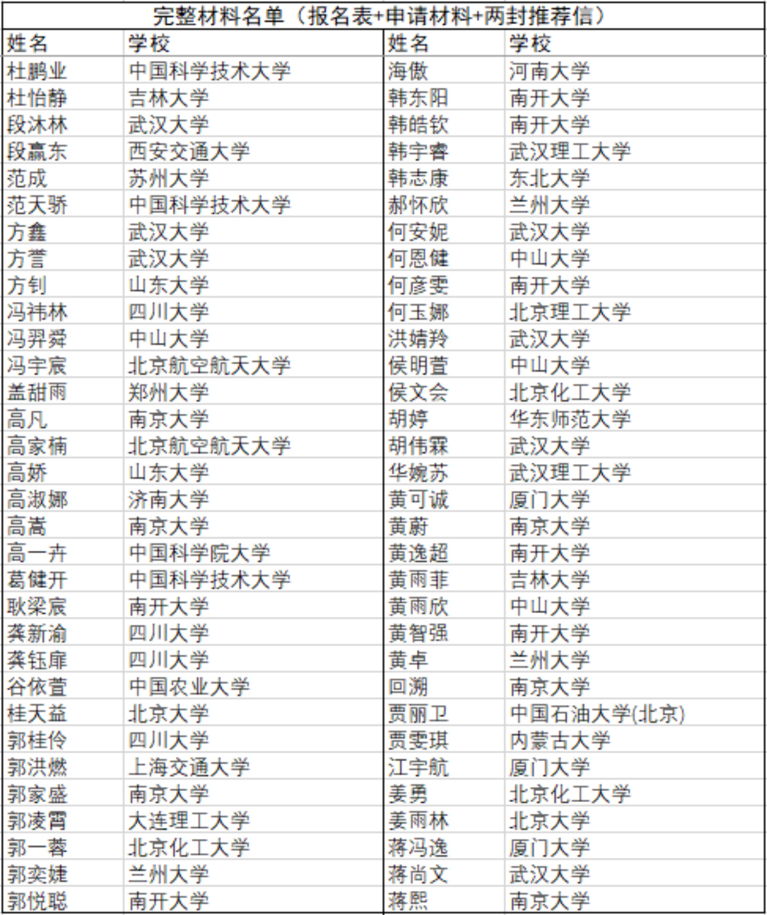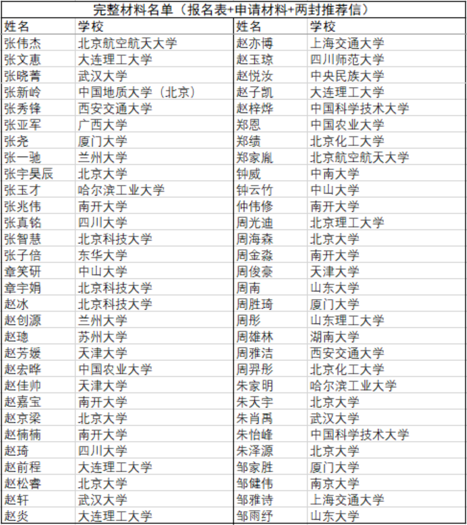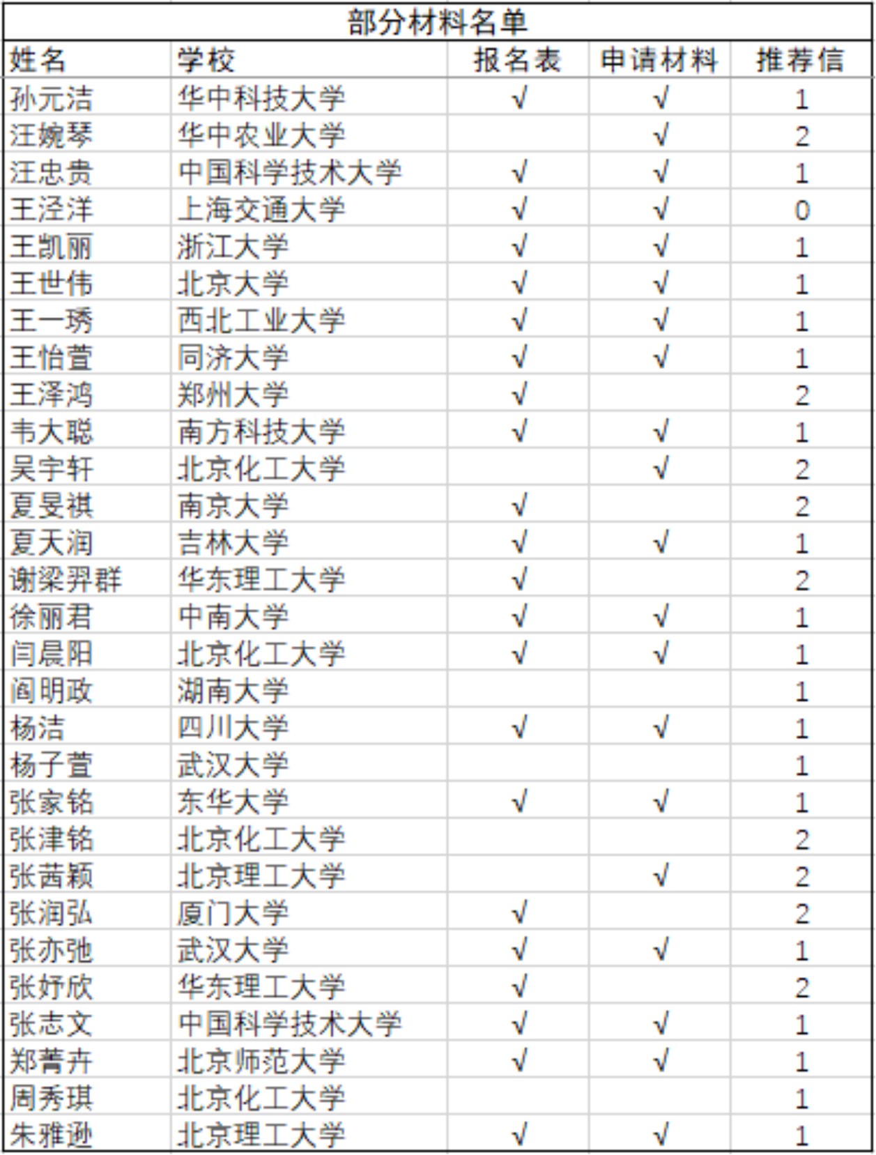 截至5月11日中午12点,2020年3003新葡官方网站化学学院全国优秀大学生夏令营收到有效材料名单如附图所示,排名按姓氏拼音顺序,如有多种读音,请按最常见读音查询。完整报名材料包括第一轮通知中的第四项网上报名问卷、第六项纸版申请材料扫描件和第七项两封专家推荐信。请各位报名的同学仔细核对名单,确认自己全部材料已经送达,如果材料有缺失或者不在名单中,请尽快向邮箱pkuccme_summercamp@163.com发送材料或者填写网上报名表问卷https://www.wjx.top/jq/67604746.aspx,已经提交过材料的同学请不要重复发送,如有问题联系化院官方微信号咨询。