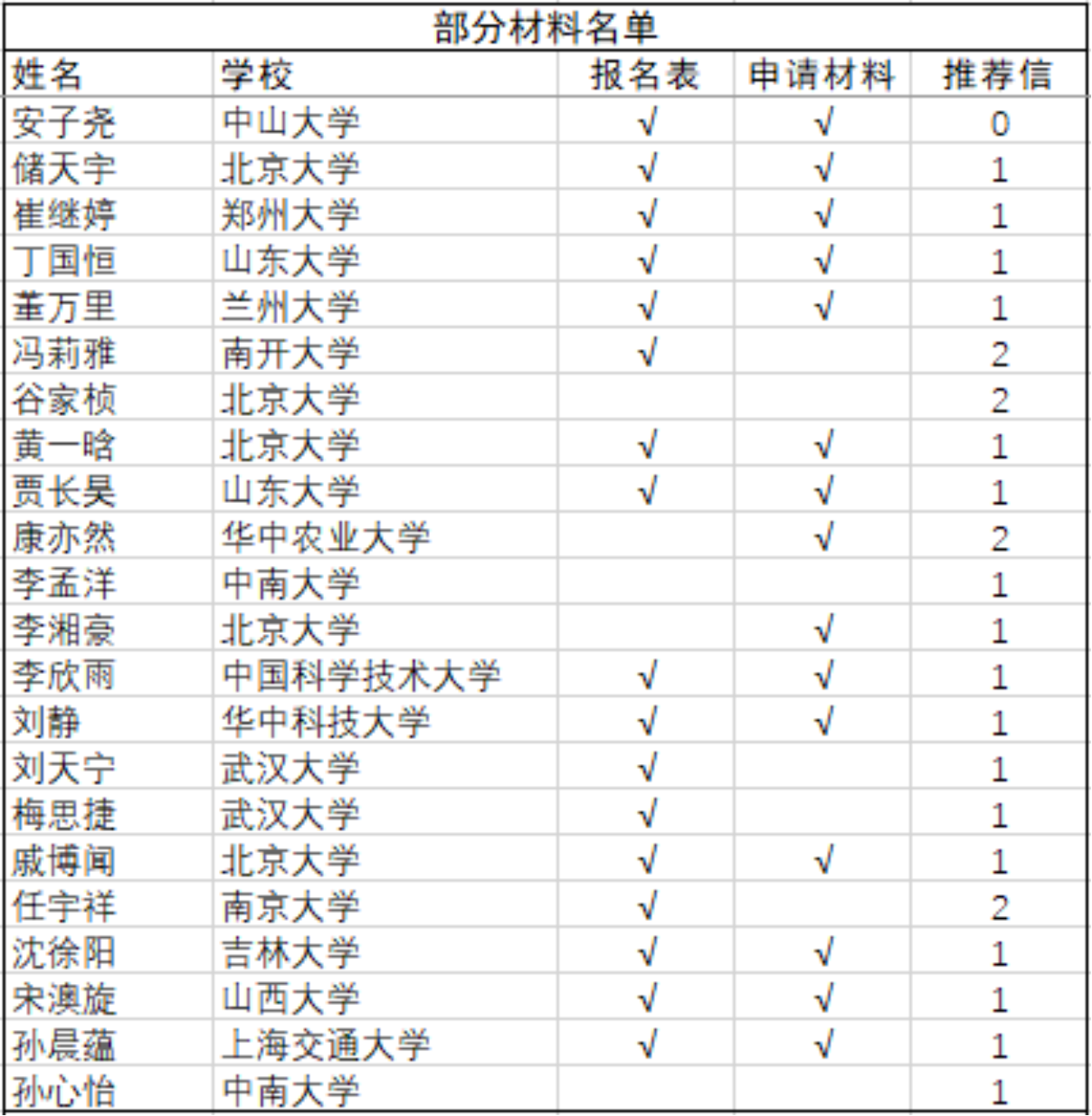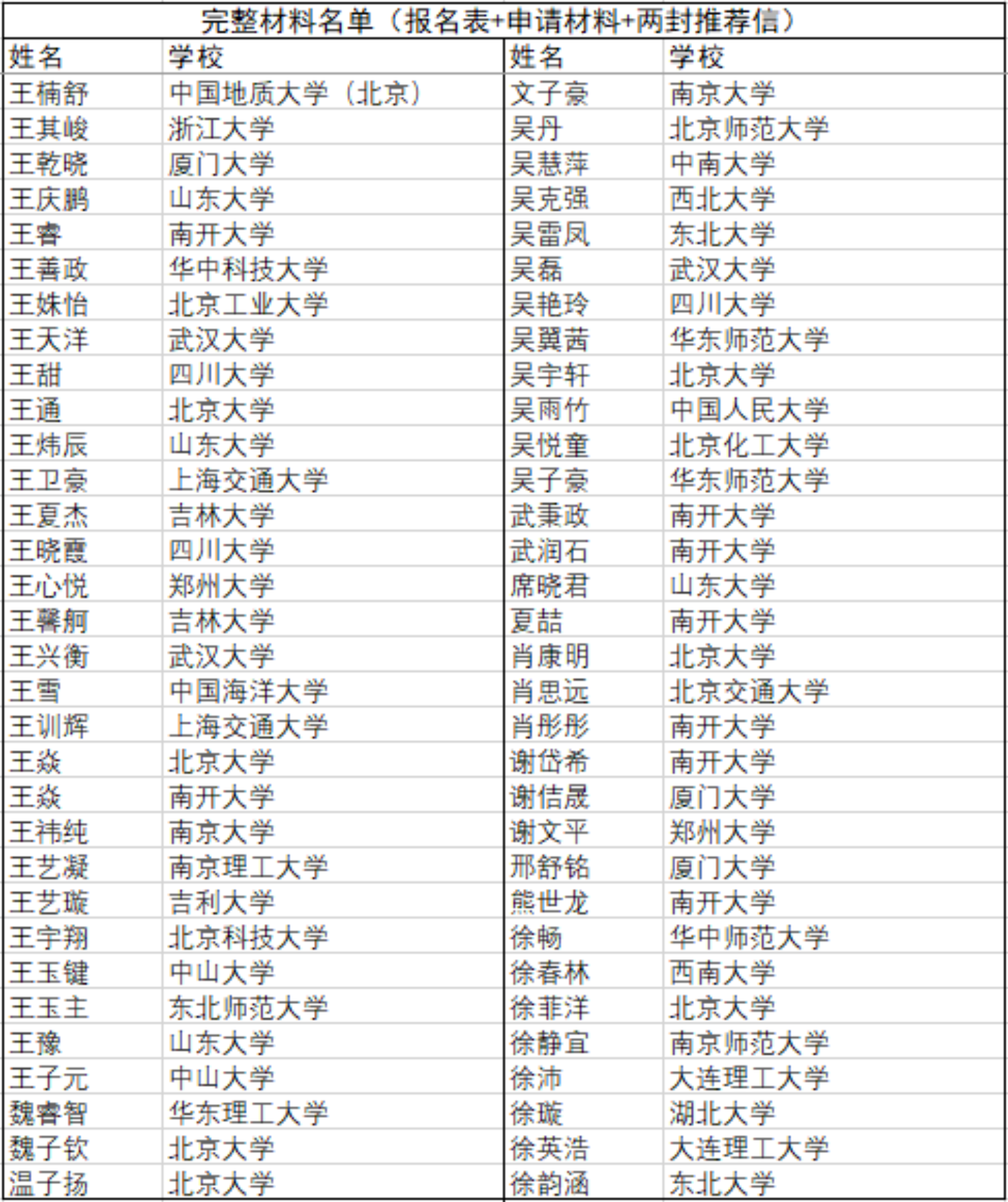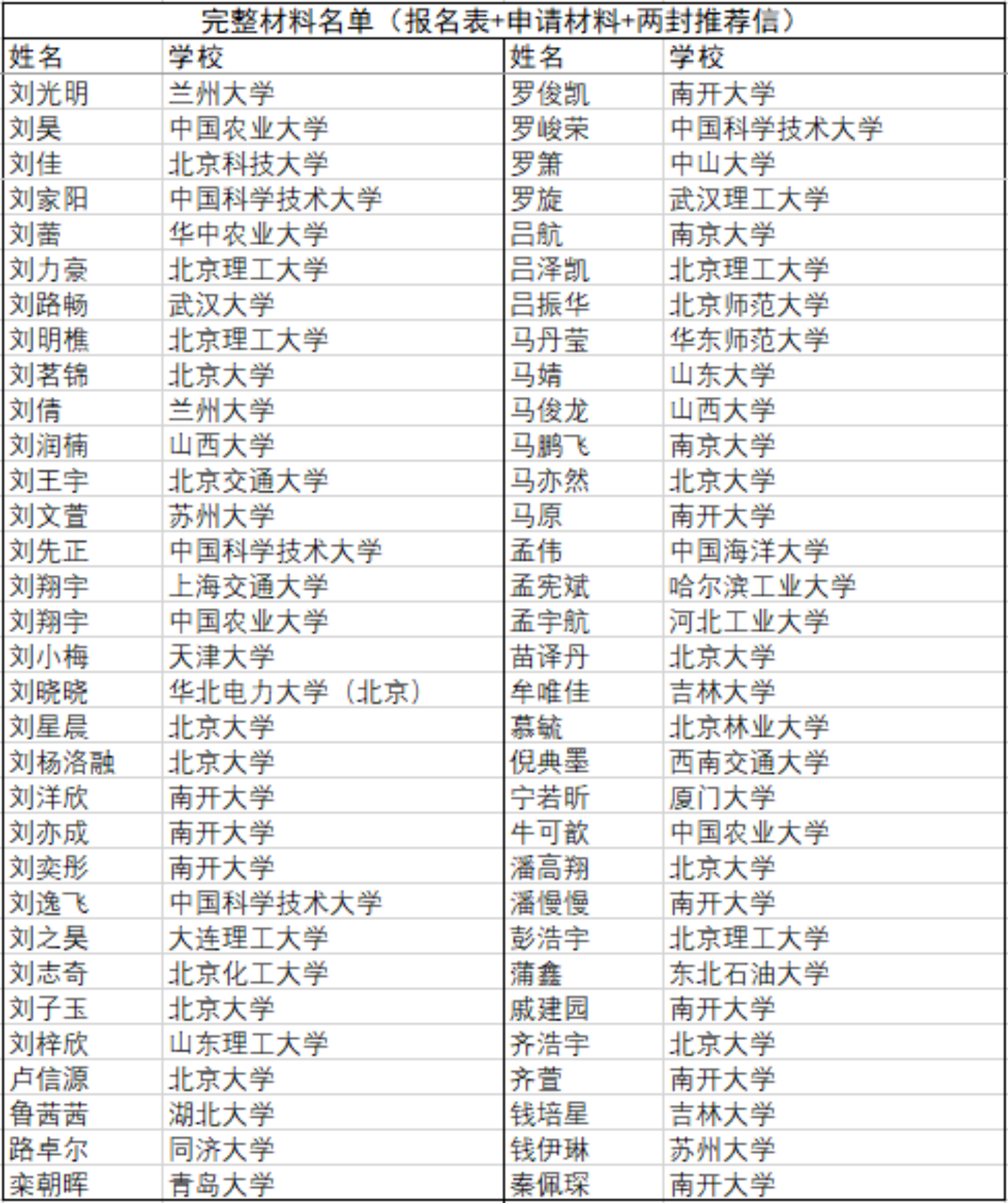 截至5月11日中午12点,2020年3003新葡官方网站化学学院全国优秀大学生夏令营收到有效材料名单如附图所示,排名按姓氏拼音顺序,如有多种读音,请按最常见读音查询。完整报名材料包括第一轮通知中的第四项网上报名问卷、第六项纸版申请材料扫描件和第七项两封专家推荐信。请各位报名的同学仔细核对名单,确认自己全部材料已经送达,如果材料有缺失或者不在名单中,请尽快向邮箱pkuccme_summercamp@163.com发送材料或者填写网上报名表问卷https://www.wjx.top/jq/67604746.aspx,已经提交过材料的同学请不要重复发送,如有问题联系化院官方微信号咨询。