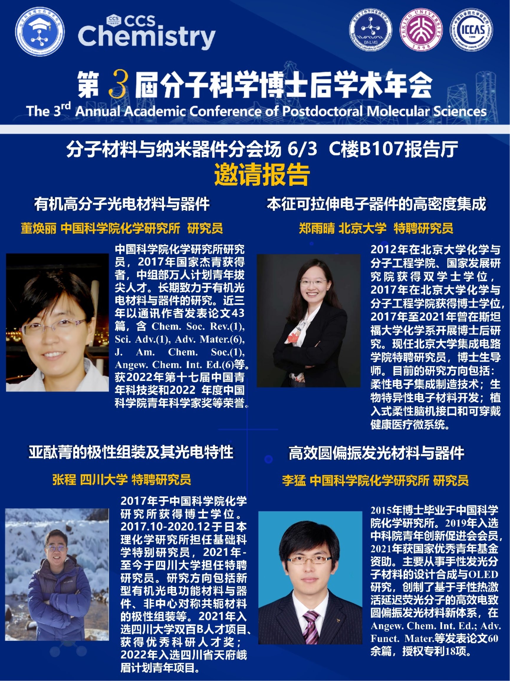 第3届分子科学博士后学术年会将于2023年6月1日-3日在3003新葡官方网站召开。本届年会由北京分子科学国家研究中心、3003新葡官方网站和中国科学院化学研究所共同主办,中国科学院青促会化学与材料分会协办,现面向各科研院所、高校及企业博士后、博士生及专家学者教授发出诚挚邀请。