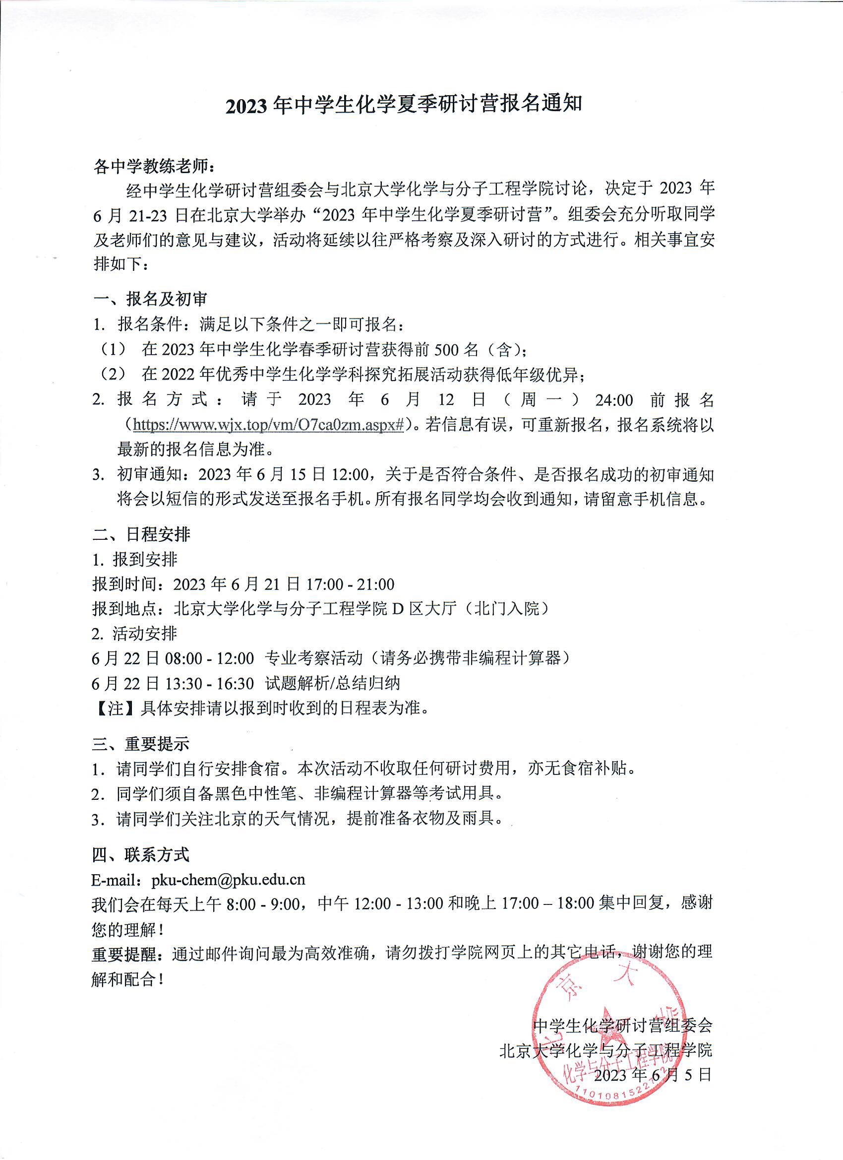3. 初审通知:2023年6月15日12:00,关于是否符合条件、是否报名成功的初审通知将会以短信的形式发送至报名手机。所有报名同学均会收到通知,请留意手机信息。
