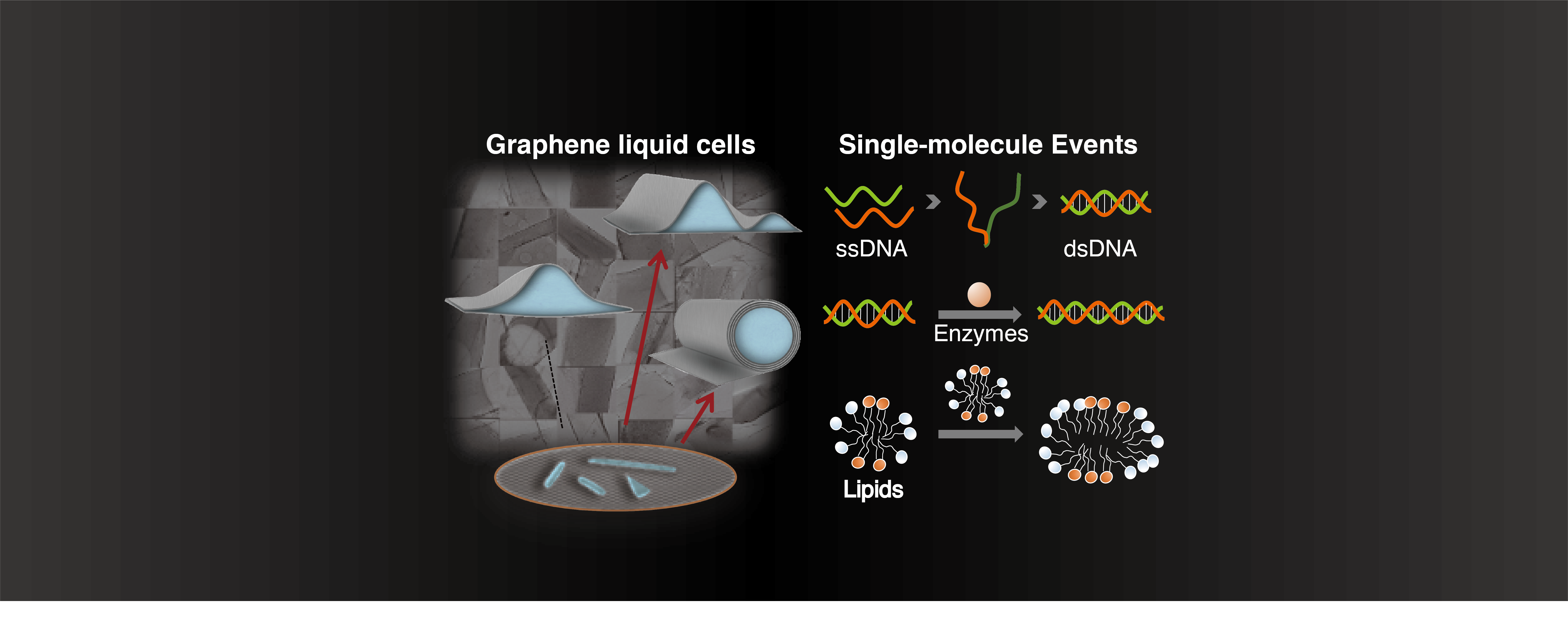 • Develop and advance analysis and imaging methods, including single molecule liquid-phase electron microscopy, optical imaging, fluorescence correlation spectroscopy, nuclear magnetic spectroscopy analysis, microfluidic chips, and in-situ correlation methods to reveal hidden nanoscale dynamics in liquid environments that are of scientific and technological relevance. We are interested in understanding the emergent dynamics and mechanisms of non-equilibrium chemical systems with a special emphasis on those consume energy to perform work. Endeavors are devised to elucidate the role of underlying elemental steps, including chemical reactions, self-assembling process, DNA/protein, and macromolecular interactions, and to correlate their time-dependent structure-function properties, for better programmability and control from the mesoscopic to the molecular level.