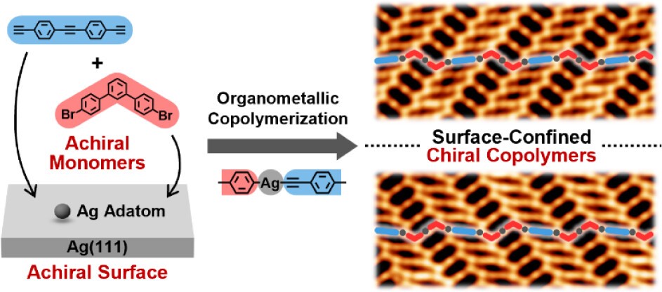 Using Achiral Monomers to Synthesize Organometallic Chiral Copolymers on an Achiral Surface