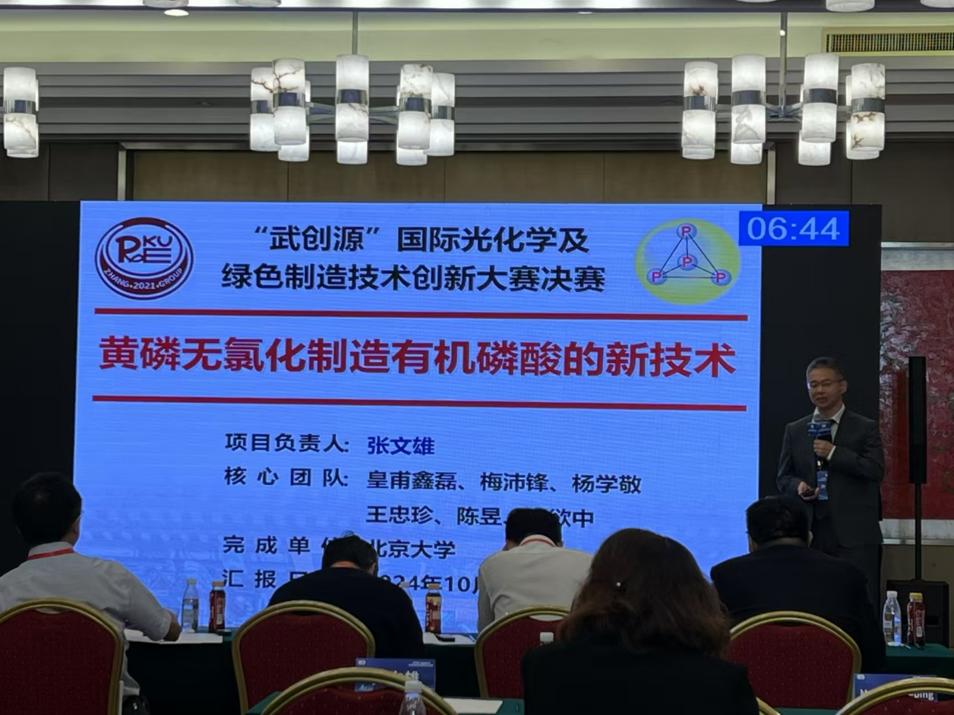 On Oct. 12, in the final competition of 20 projects in Group B of the first "WuChuangyuan" International Photochemistry and Green Manufacturing Technology Innovation Competition, Zhang Wenxiong's team project "New technology for the manufacture of organophosphorus acid without chlorination of yellow phosphorus" ranked second and won the innovation award of this competition.