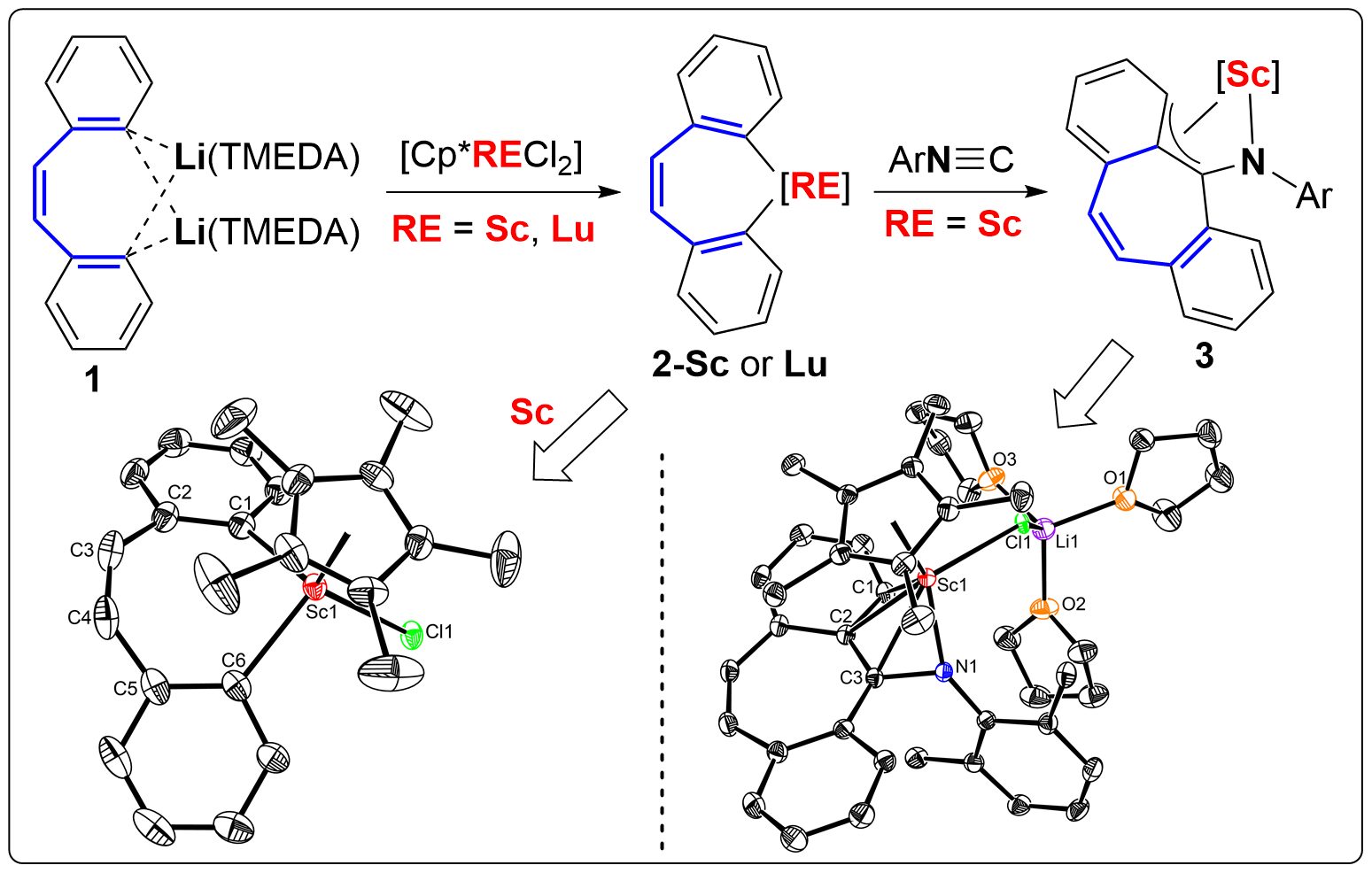 As the key intermediates in metal catalyzed [2 + 2 + 2] cycloaddition reactions of three alkynes, main-group and transition metallacycloheptatrienes have been studied for decades, but rare-earth analogues have remained exclusive. Herein, we report the well-defined rare-earth metallacycloheptatrienes 2-Sc and 2-Lu obtained in high yields via the reaction of Cp*Li (Cp* = pentamethylcyclopentadienyl) and RECl3 (RE = Sc, Lu) with TMEDA coordinated 2,2'-dilithio- Z -stilbene 1. Single crystal structure of 2-Sc (RE = Sc) reveals it to be a separate ion pair, and the scandacycloheptatriene ring adopts a nonplanar boat-like conformation. The reactivity of compounds 2-Sc and 2-Lu has been investigated. When 2-Sc was treated with 2,6-dimethylphenyl isocyanide, compound 3 was obtained via the successive 1,1-insertion and 1,2-insertion of the isocyanide. The structure of 3 has also been fully characterized.