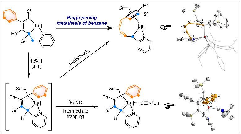Activation of inert C–C bonds in arenes remains a formidable challenge in synthetic chemistry. Despite advances in arene C–C bond activation, metathesis transformations of aromatic C–C bonds remain largely unexplored. Recently, we uncovered a rare-earth metal-enabled intramolecular metathesis between a benzene C–C bond and a C–C single bond, assisted by the high reactivity and synergistic effect of rare-earth metallacycles. Mechanistic studies reveal a stepwise [2+2] cycloaddition/cycloreversion sequence via a fused tricyclic intermediate. This transformation expands the chemical space of arene reactivity, providing a rare example of aromatic ring-opening metathesis through a non-carbene pathway.