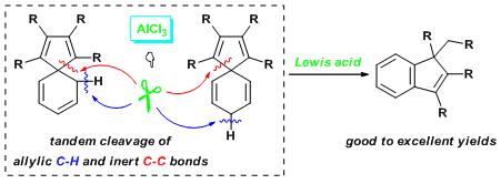Skeletal Rearrangement of All-carbon Spiro SkeletonsMediated by Lewis AcidFei Zhao, Chao Wang, Lantao Liu, Wen-Xiong Zhang, and Zhenfeng Xi*Chem. Commun. 2009, ASAP online.Mediated by AlCl3, substituted spiro[4.5]deca-tetraenesunderwent novel and selective skeletal rearrangement to generate indene derivatives in high to excellent yields.Selective cleavage of C-C and C-H bond is of great importance both fundamentally and practically. Sequential cleavage of both C–C and C–H bonds in all-carbon cyclic compounds spiro[4.5]deca-tetraenes was achieved to generate indene derivates via a novel AlCl3-mediated process.