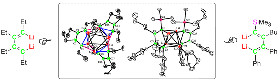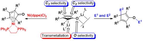 Isolation, Structural Characterization, and Synthetic Application of Oxy-cyclopentadienyl DianionsLantao Liu, Wen-Xiong Zhang, Chao Wang, Congyang Wang, and Zhenfeng Xi*Angew. Chem. Int. Ed. 2009, 48, in press.Isolation and applications of OCp: Novel cyclic dianions, lithio oxycyclopentadienyl dianions were isolated in high yields and structurally characterized by X-ray single crystal structural analysis. Interesting reaction chemistry and useful synthetic applications of these cyclic dianions were demonstrated to afford cyclopentadienes or transition-metal complexes.Cyclic dianions are very important synthetically useful intermediates for construction of organic compounds and organometallic complexes. However, synthetic methods and structural information for cyclic dianions are very much limited.This paper reports the first isolation and X-ray structural characterization of novel oxy-cyclopentadienyl (OCp for short) dianions generated via a concise reaction of 1,4-dilithio-1,3-butadienes with CO. The concomitance of the CpLi moiety, the exocyclic oxy anion, and those multi-reactive sites makes such dianion species structurally very unique and of novel reaction chemistry.