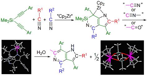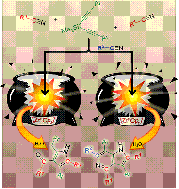研究室工作进展 Nov. 1, 2009One-pot Multicomponent Synthesis of Azaindoles and Pyrroles from OneMolecule of a Silicon-Tethered Diyne and Three or Two Molecules ofOrganonitriles Mediated by ZirconoceneShaoguang Zhang, Xiaohua Sun, Wen-Xiong Zhang, and Zhenfeng Xi*Chem. Eur. J. 2009, ASAP online October 31A zirconocene-mediated one-pot multi-component synthesis process has been developed, leading to the synthesis of 5-azaindoles and pyrrole derivatives, from a Si-tethered diyne and three or two different or identical organonitriles. 5-Azaindoles and pyrrole derivatives of diversified structures and substitution patterns could be highly selectively prepared via this protocol. A wide variety of organonitriles and Si-tethered diynes, either aliphatic or aromatic with both electron-withdrawing groups and electron-donating groups, could be used to afford 5-azaindoles and/or pyrroles in good-to-excellent isolated yields. A key intermediate formed in the Cp2Zr(II)-mediated reaction of one (PhC≡C)2SiMe2, two molecules of i-PrCN and one p-TolylCN was characterized by X-ray single-crystal structural analysis, which has allowed us to gain a good understanding of the reaction process.