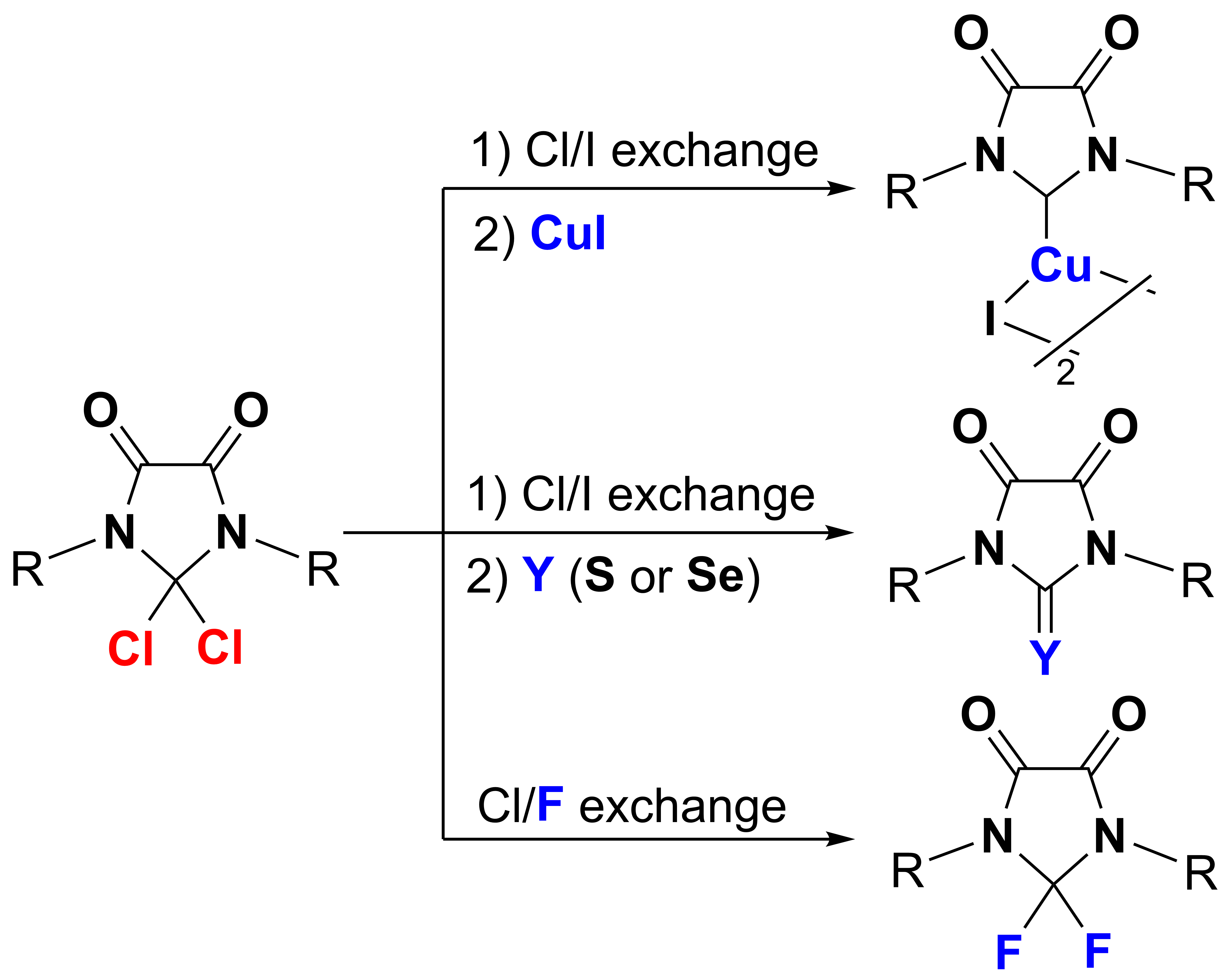 Novel Reactivities of 2,2-Dichloroimidazolidine-4,5-diones: Synthesis of Copper(I) Diamidocarbene Complex, 2-Thioxo/Selenoxoimidazolidine-4,5-dione and 2,2-Difluoroimidazolidine-4,5-dione
