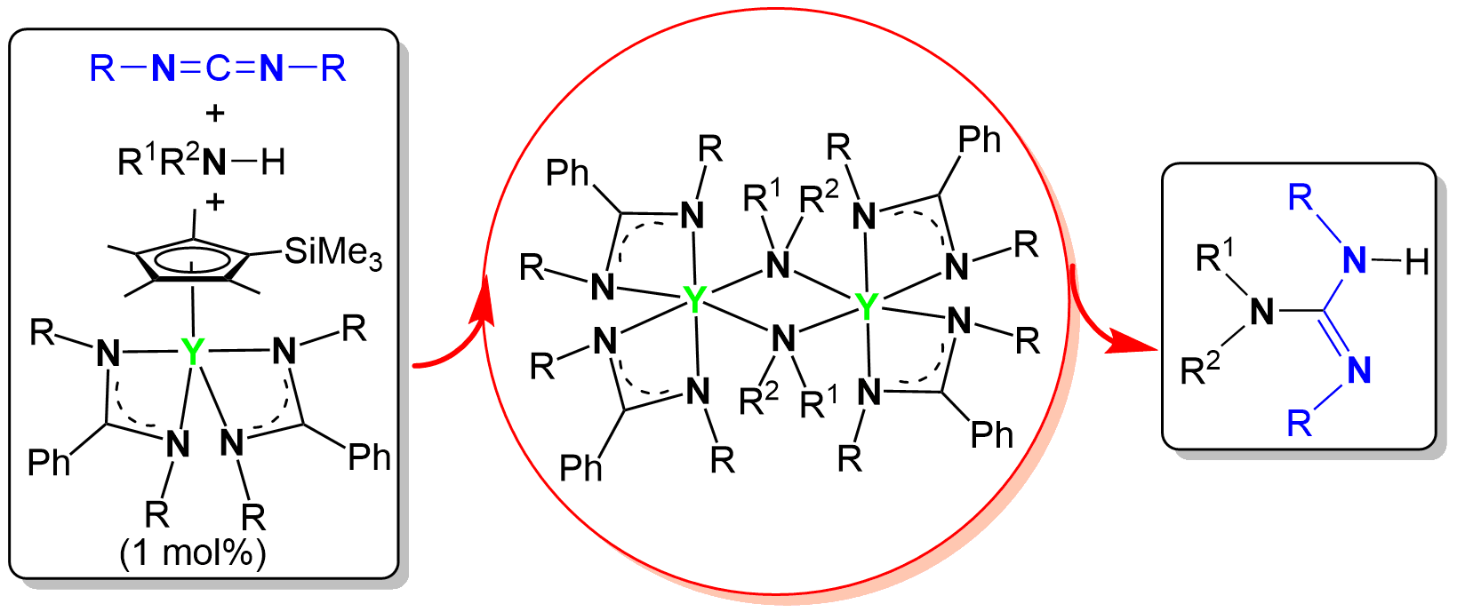 A series of mixed Cp′/bis(amidinato) (Cp′ = η5-C5Me4(SiMe3)) lanthanide complexes were synthesized by the 1:2 acid−base reaction between Cp′Ln(CH2SiMe3)2(THF) (Ln = Y, Dy, Er, Lu) and amidines. These Cp′/bis(amidinato) complexes showed excellent catalytic activity for the addition of amines to carbodiimides, yielding the corresponding guanidines. Isolation, structural characterization, and catalytic application of the binuclear lutetium amido complex showed clearly that the catalytic cycle was initiated by the dissociation of Cp′. These results demonstrated that Cp′, for the ?rst time, acted as a reactive site to yield the active Ln−N species.