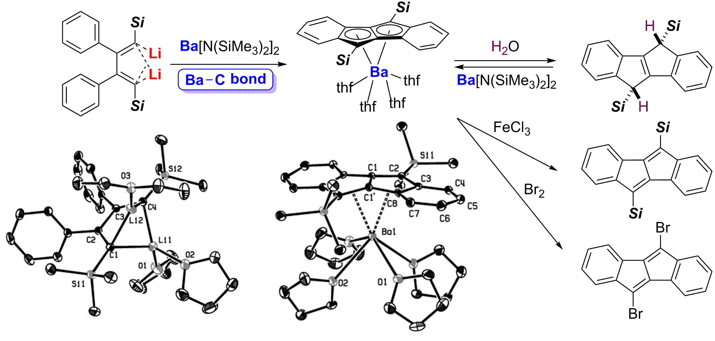 The first main-group metal η8 complex coordinated with a dibenzopentalene dianion has been synthesized and structurally characterized. The barium dibenzopentalenides, in which the single barium atom is coordinated to the parent pentalene in an η8 fashion, were synthesized from 2,3-diphenyl 1,4-dilithio-1,3- butadienes and Ba[N(SiMe3)2]2 via formation of Ba-C (sp2) bonds. Preliminary reaction chemistry study of thus obtained barium dibenzopentalenides has demonstrated that synthetically useful applications can be expected.
