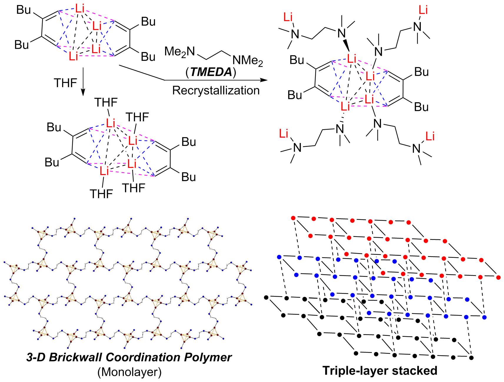 The synthesis and X-ray crystallographic structure of a 3-D brickwall coordination polymer of TMEDA-supported dimeric 2,3-dialkyl-1,4-dilithio-1,3-butadiene are reported. TMEDAs behave as bridging coordinating ligands rather than intramolecular chelating ligands. The Li4-tetrahedron core was stable toward the deaggregation of TMEDA because of the small steric hindrance on the butadiene skeleton.