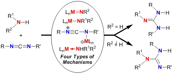 Catalytic guanylation reaction of amines with carbodiimides has received the increasing attention because of the atom-economical preparation of guanidines since 2003. To date, more than forty catalysts including transition metals, main group and rare-earth metals have been designed and tested for the guanylation reaction to construct acyclic and cyclic guanidines. In this review, we present a mechanistic consideration on catalytic guanylation reaction of amines with carbodiimides for guanidine synthesis to elucidate its development and importance. Four different types of reaction mechanisms are well categorized: [2+2]-cycloaddition/protonation mechanism, insertion/protonation mechanism, activation of carbodiimide/nucleophilic addition/intramolecular protonation mechanism, and protonation/nucleophilic addition/disassociation mechanism. It is useful to understand this reaction processes and accelerate the rapid development in the related area to meet the needs of the growing guanidines.
