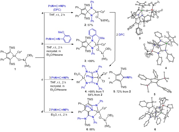 Metallacyclopentadienes of s-, p- and d-block metals have received considerable attention. However, rare-earth metallacyclopentadienes were not achieved until very recently, we reported the first well-defined f-block lutetacyclopentadienes (Chem. Eur. J. 2015, 21, 6686-6689). The lutetacyclopentadiene showed excellent reactivity towards some small molecules. Its reactivity towards DPC is investigated in detail in this work(Chem. Eur. J. 2015, 21, 15860-15866.). This system can afford three types of new N-containing fused cyclic complexes. The product complexes significantly depend on the properties of the metal center, the concentration of LiCl, the number of equivalents of DPC and the solvent. We proposed a mechanism to explain the results by using DFT calculation.