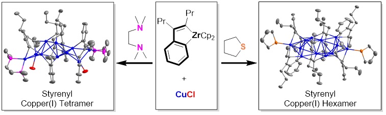 In this work, two examples of mixed alkenyl/aryl organocopper(I) aggregates possessing conjugated alkenyl/aryl C–Cu bonds were synthesized by transmetallation of zirconaindenes with CuCl. Single crystal X-ray structural analysis revealed tetrameric and hexameric structures. Butadienyl copper(I) aggregates were also synthesized and structurally characterized for further comparison. Preliminary reaction chemistry of the copper(I) aggregates were studied.