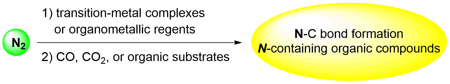 As a grand research area closely related to human civilization and living, the activation and transformation of dinitrogen (nitrogen fixation) under mild conditions used to be a central research theme worldwide in the 1970’s-1990’s. Nitrogen fixation is the process by which atmospheric nitrogen is directly converted to a bioavailable form. This basic chemical reaction process is essential to sustaining all life on this planet. However, due to great challenging of the nature of this research, slow progress and worldwide change of academic culture, the number of researchers engaged in this fundamental research area has been drastically reduced. Nevertheless, there is no doubt that realizing activation and transformation of dinitrogen under mild conditions is a grand scientific problem that people need to solve, required by sustainable development of human society. It is thus one of the most important missions of scientists, especially chemists. Three types of N-containing products can be obtained through direct transformation of dinitrogen. The most popular one is the formation of ammonia NH3 and NxHy. The industrial Haber-Bosch process, which requires harsh reaction conditions such as high temperature and pressure and uses at least 1-2% of the annual primary energy supply in the world, is still the main method to produce ammonia from molecular dinitrogen and dihydrogen gases. Inspired by the investigation of nitrogenase and the discovery of the first molecular nitrogen complex in 1965, chemists have paid more attention to achieving the reduction of dinitrogen to ammonia with transition metal complexes either as regents or as catalysts. Reports on the other two types of products, the N-E (E = P, Si) bonding compounds, and the N-C bonding compounds, are very rare. Compared with ammonia, nitrogen-containing organic compounds such as amines, amides, imides, amino acids and aza-heterocycles are also high-value products. This review mainly summarizes the progress in the field of direct transformation of molecular nitrogen to nitrogen-containing organic compounds by using transition metal complexes, as well as the elucidation of transformation mechanisms. The N-containing organic compounds thus formed include amines, amides, imides, nitriles, diazenes, azines, carbodiimides, isocyanates and heterocycles. Although some progress has been achieved, examples are still very much limited, efficiency is generally very low. Transition metal complex-catalyzed reaction process is in great demand. Synergetic strategy is considered to be one of the efficient ways to realize transition metal complex-catalyzed direct transformation of molecular nitrogen to nitrogen-containing organic compounds under mild conditions.