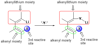 本文简要综述了有关1-锂-1,3-丁二烯衍生物反应的最新进展。就1-锂-1,3-丁二烯衍生物而言,至少有三个反应位点:1)烯基锂部分,2)1,3-丁二烯骨架,3)X取代基。我们发现,1-锂-1,3-丁二烯衍生物能够发生许多不同于普通有机锂试剂的反应,能与不饱和C-O和C-N化合物发生分子间和分子内的反应,这些特殊反应性能主要是由于碳-锂键和丁二烯共轭骨架之间的“协同效应”以及丁二烯共轭骨架上的取代基所致。