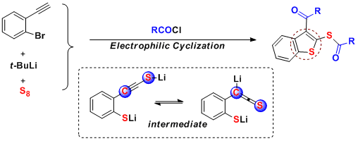 Benzothiophene derivatives, a class of important compounds in many aspects, were synthesized in high yields from readily available o-(alkynyllithio)aryllithio compounds, sulfur, and two equivalents of acid chlorides or other electrophiles. An acid chloride-induced electrophilic cyclization resulted in the formation of the thiophene ring.
