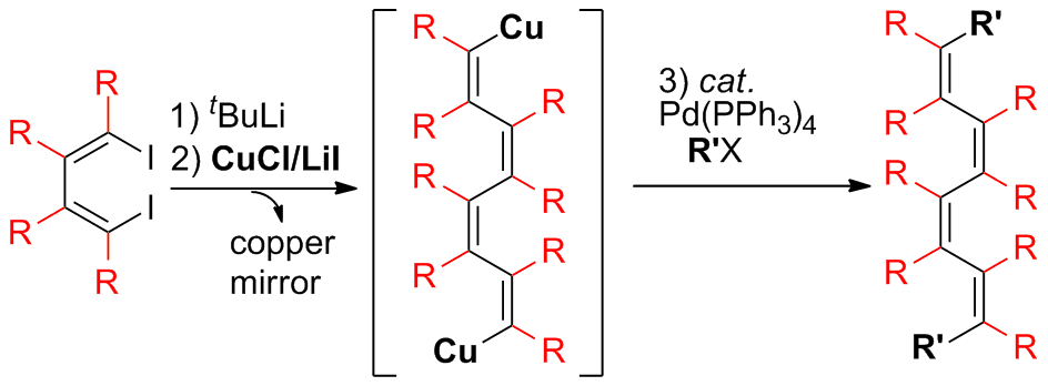 This research group has been working, for 15 years, on the synthesis and synthetic applications of multiply substituted 1-lithio 1,3-butadienes and 1,4-dilithio 1,3-butadienes(see for reviews: Acc. Chem. Res. 2010, 43, 1342-1351; Pure and Applied Chemistry 2009, 81, 235-246; Bull. Chem. Soc. Jpn. 2007, 80, 1021-1036; Eur. J. Org. Chem. 2004, 2773-2781). The alkyl substituents on the butadienyl skeletons are all-cis oriented. The addition of lithium iodide was found in this work very effective for the thermal decomposition-linear dimerization of alkenylcopper compounds.
