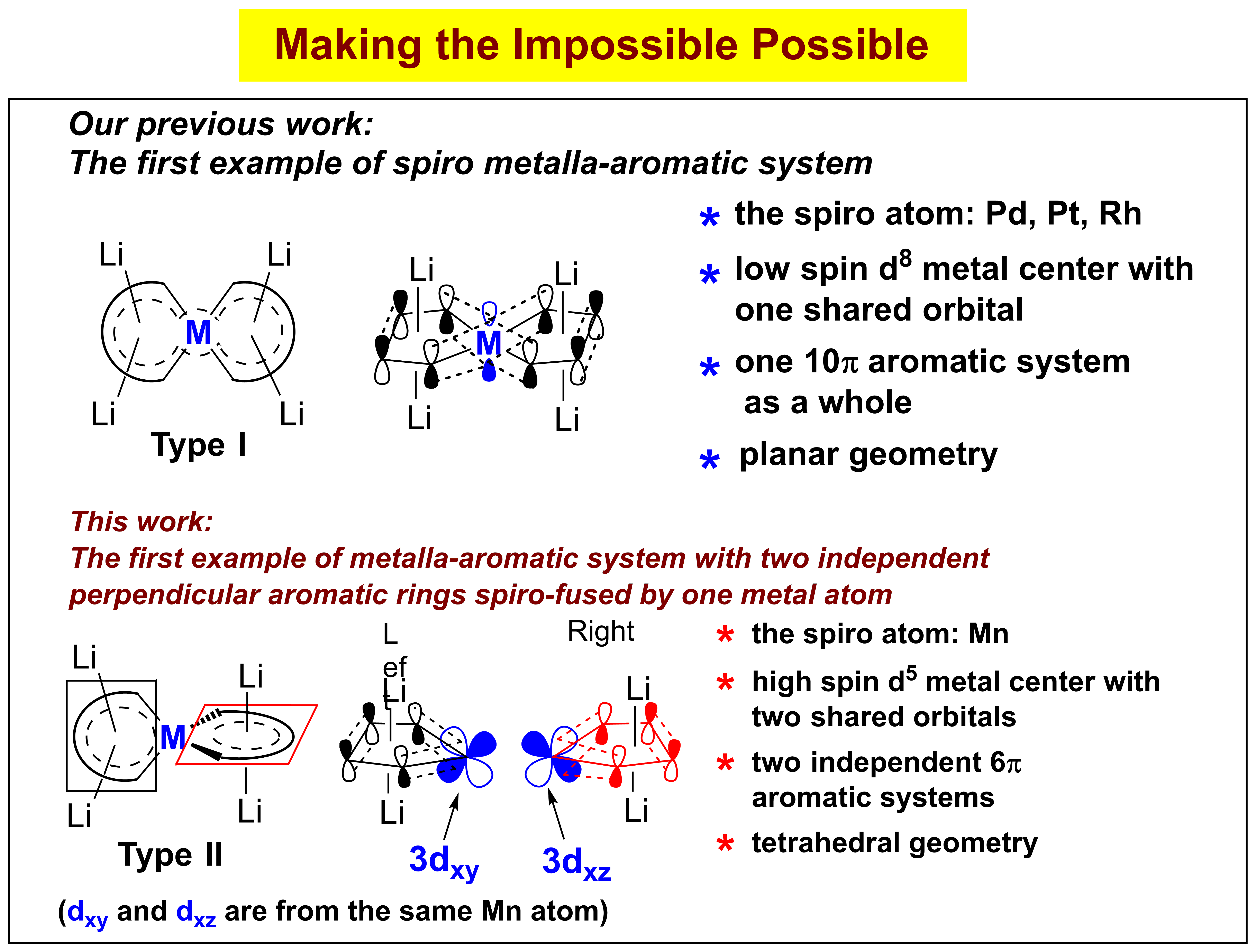 螺环化合物[碳为螺原子]是有机化学中常见的环状化合物。碳原子的成键本质决定了有机螺环化合物不可能具有芳香性。但是,如果把碳螺原子换成过渡金属,则构成金属杂螺环化合物[金属离子为螺原子]。由于金属的轨道特性,金属杂螺芳香性化合物就成为可能。本研究室已经发现双锂试剂的共轭丁二烯骨架能够同两个碳负离子产生“协同效应”,使其LUMO轨道能级相对于1,3-丁二烯显著降低,从而可以接受合适的过渡金属的d电子并离域至其π*轨道(魏俊年等,Angew. Chem. Int. Ed. 2015, 54, 5999; 2015, 54, 9986; J. Am. Chem. Soc. 2016, 138, 60.)。2017年,张永亮等同学利用双锂试剂的这一独特性质并结合过渡金属配位化学,首次成功合成了螺原子为Pt, Pd, Rh的金属杂螺芳香化合物(张永亮等,J. Am. Chem. Soc. 2017, 139, 5039)。在该类芳香性体系中(上图I),过渡金属螺原子利用其一个pz轨道中的两个电子与周边八个碳原子的八个电子构成一个10π电子芳香性结构,每一个五元环都是平面的,而两个五元螺环也趋向于相互平行;但是,在本工作中(上图II),张永亮等同学合成了第二类螺芳香性化合物,该类螺芳香性化合物与第一类显著不同,其中螺原子Mn利用其3dxy和3dxz轨道分别与左右的两个四碳共轭部分构成了两个独立的五元6π电子平面芳香性结构,而两个五元螺环是相互垂直的。
