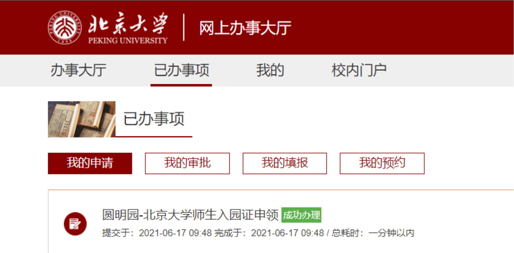 之前在校内门户进行线上申领的师生,请登录“个人门户-网上办事大厅-已办事项”中查询办理进度,已成功办理入园证的师生无须参与线下办理,如有其他申请相关问题,可联系 yuanmingyuanryz@163.com。